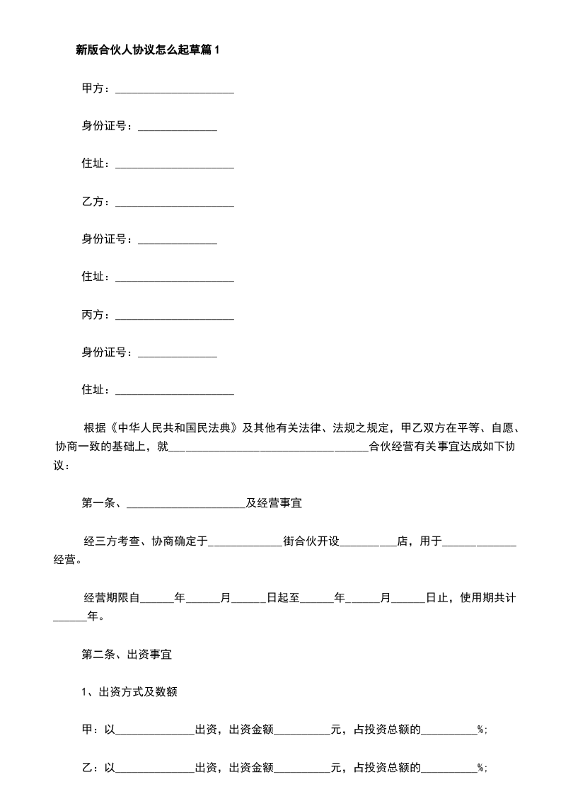 新版合伙人协议怎么起草篇1