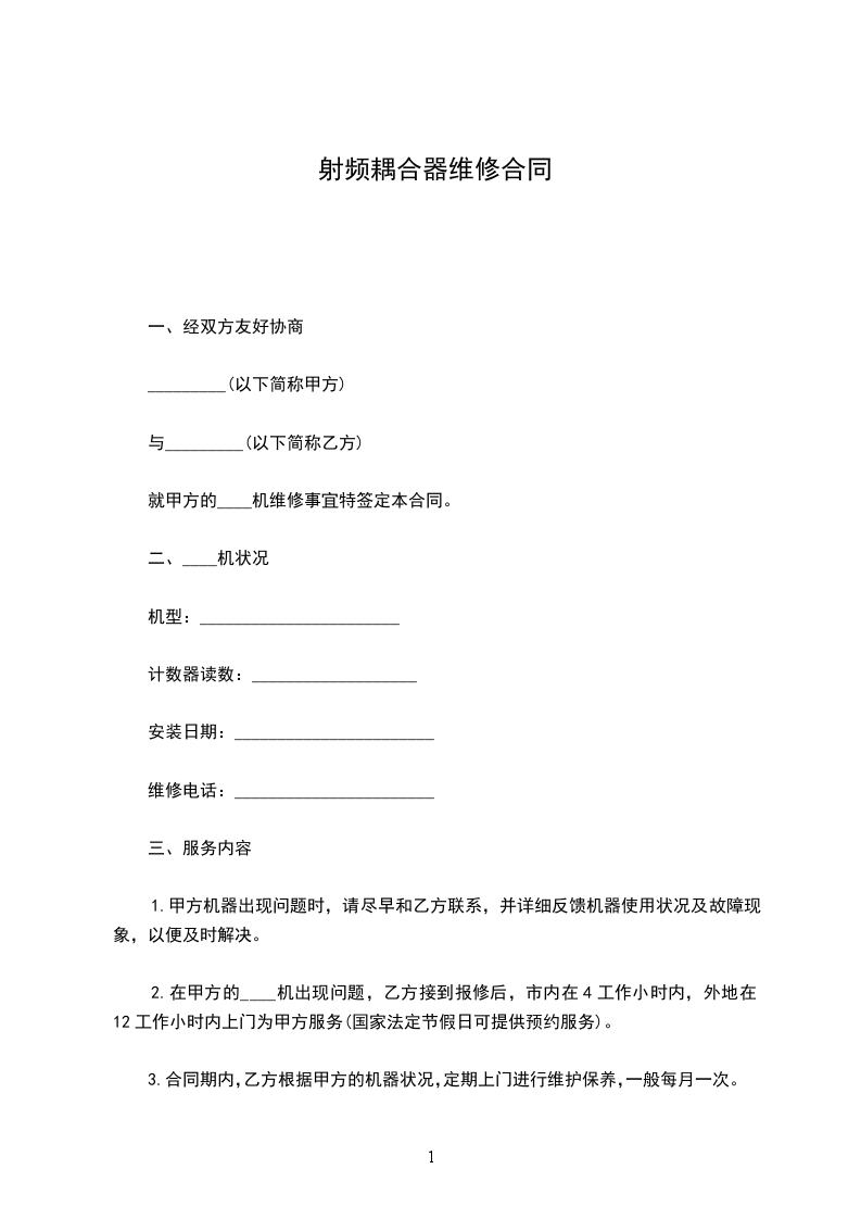 四、根据____机的状况,经双方协商,同意乙方收取甲方____机年维修费为人民币(大写)______元,(小写)¥______元。