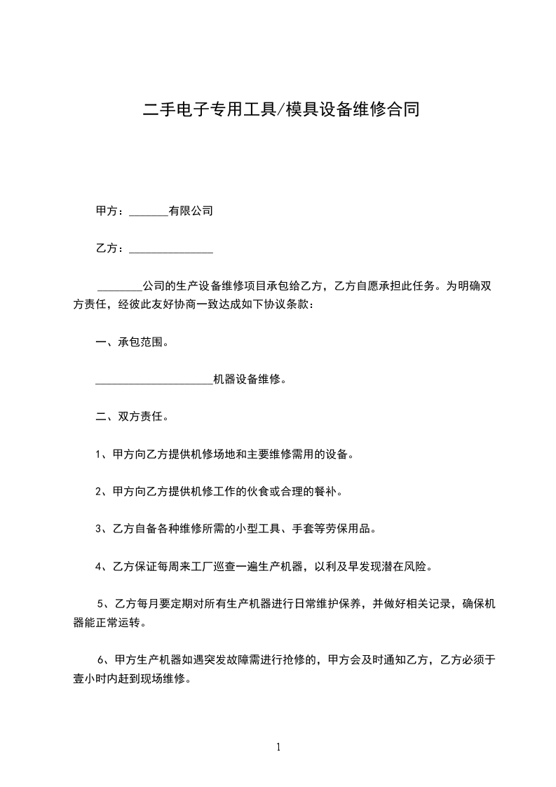 1、甲方向乙方提供机修场地和主要维修需用的设备。