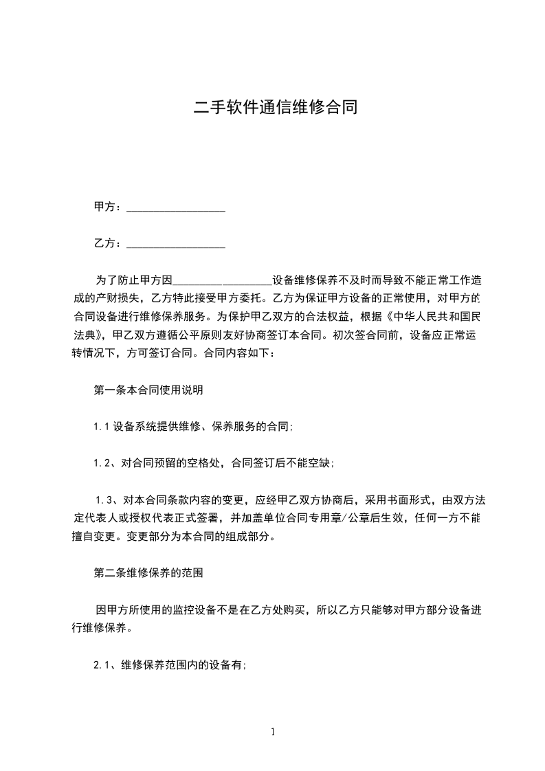 为了防止甲方因__________________设备维修保养不及时而导致不能正常工作造成的产财损失,乙方特此接受甲方委托。乙方为保证甲方设备的正常使用,对甲方的合同设备进行维修保养服务。为保护甲乙双方的合法权益,根据《中华人民共和国民法典》,甲乙双方遵循公平原则友好协商签订本合同。初次签合同前,设备应正常运转情况下,方可签订合同。合同内容如下: