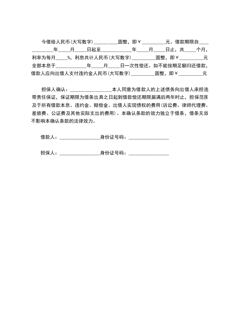 担保人确认:_________________本人同意为借款人的上述债务向出借人承担连带责任保证,保证期限为借条出具之日起到借款偿还期限届满后两年时止,担保范围及于所有借款本息、违约金、赔偿金、出借人实现债权的费用(诉讼费、律师代理费、差旅费、公证费及其他实际支出的费用)。本确认条款的效力独立于借条,借条无效不影响本确认条款的法律效力。