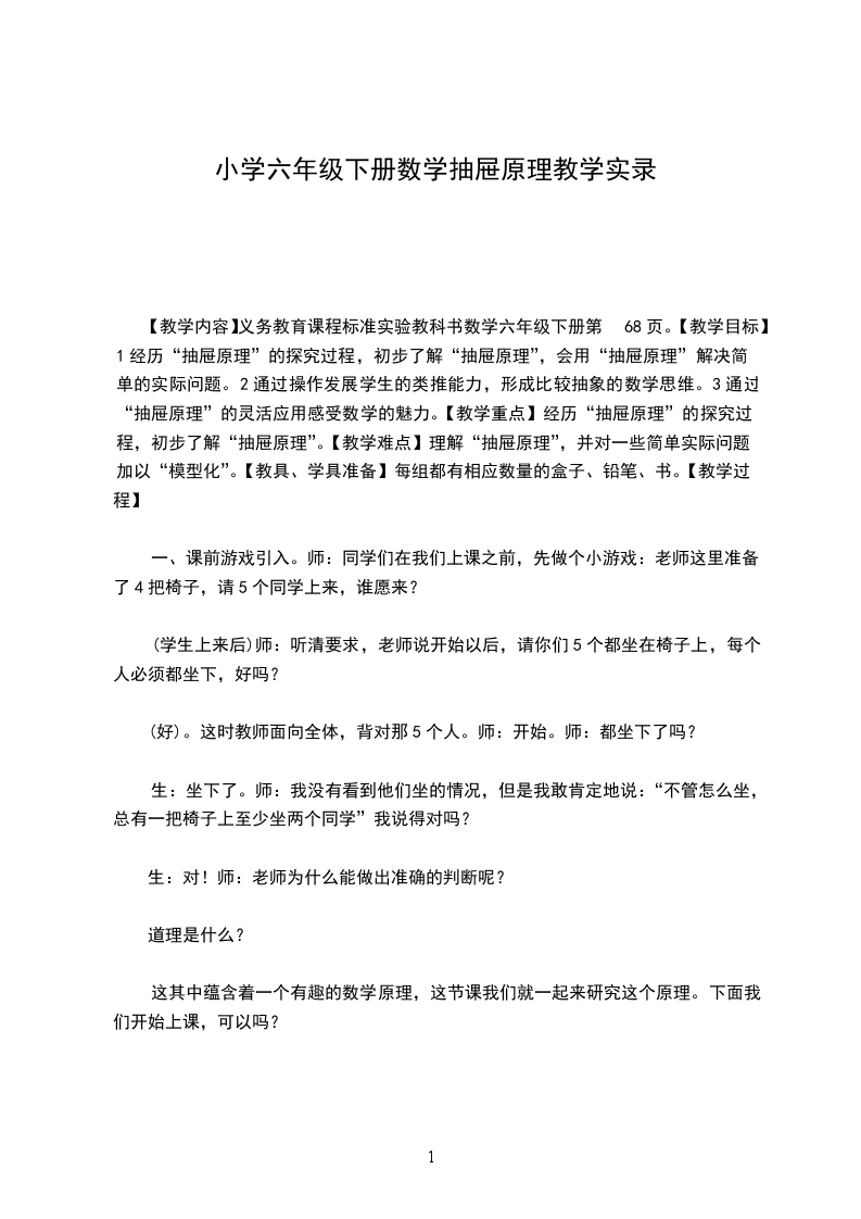 【教学内容】义务教育课程标准实验教科书数学六年级下册第68页。【教学目标】1经历“抽屉原理”的探究过程,初步了解“抽屉原理”,会用“抽屉原理”解决简单的实际问题。2通过操作发展学生的类推能力,形成比较抽象的数学思维。3通过“抽屉原理”的灵活应用感受数学的魅力。【教学重点】经历“抽屉原理”的探究过程,初步了解“抽屉原理”。【教学难点】理解“抽屉原理”,并对一些简单实际问题加以“模型化”。【教具、学具准备】每组都有相应数量的盒子、铅笔、书。【教学过程】