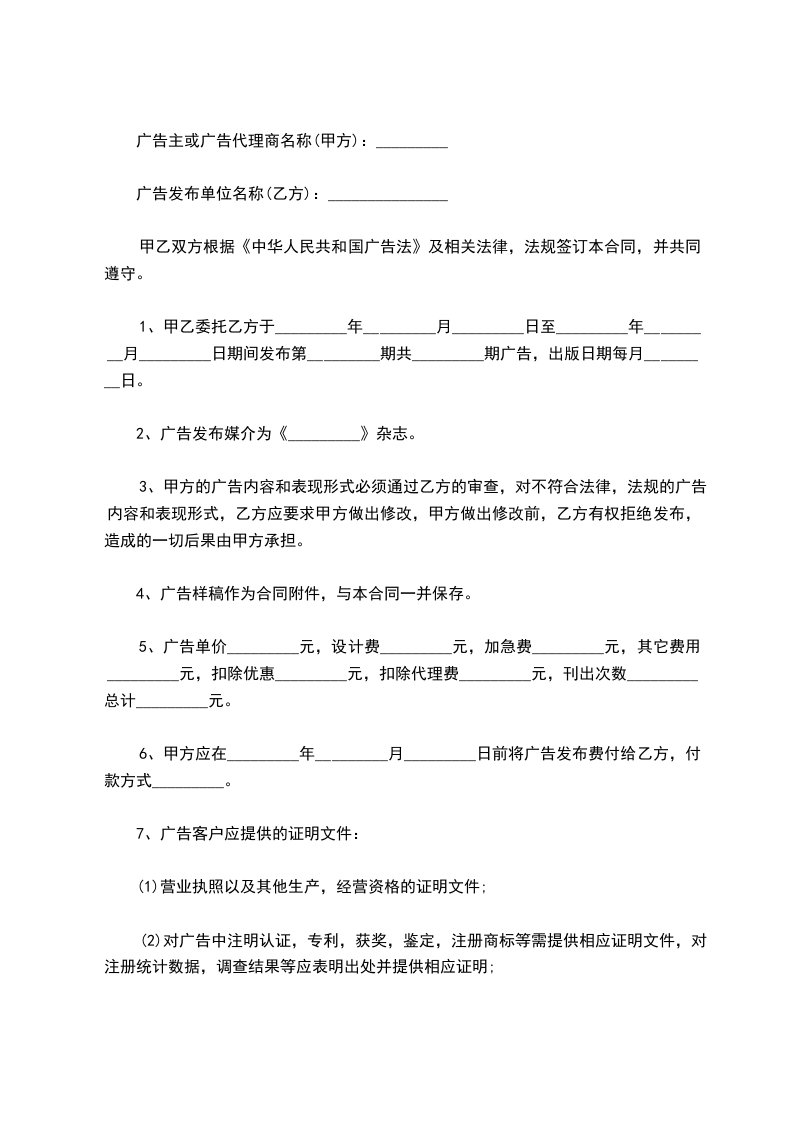 8、乙方可自行在全国征地区广告代理,乙方所征订的广告或者软文广告必须符合中国现行的《广告法》及相关的法律,法规,如有歧义时甲方有权利删减或不与刊登;
