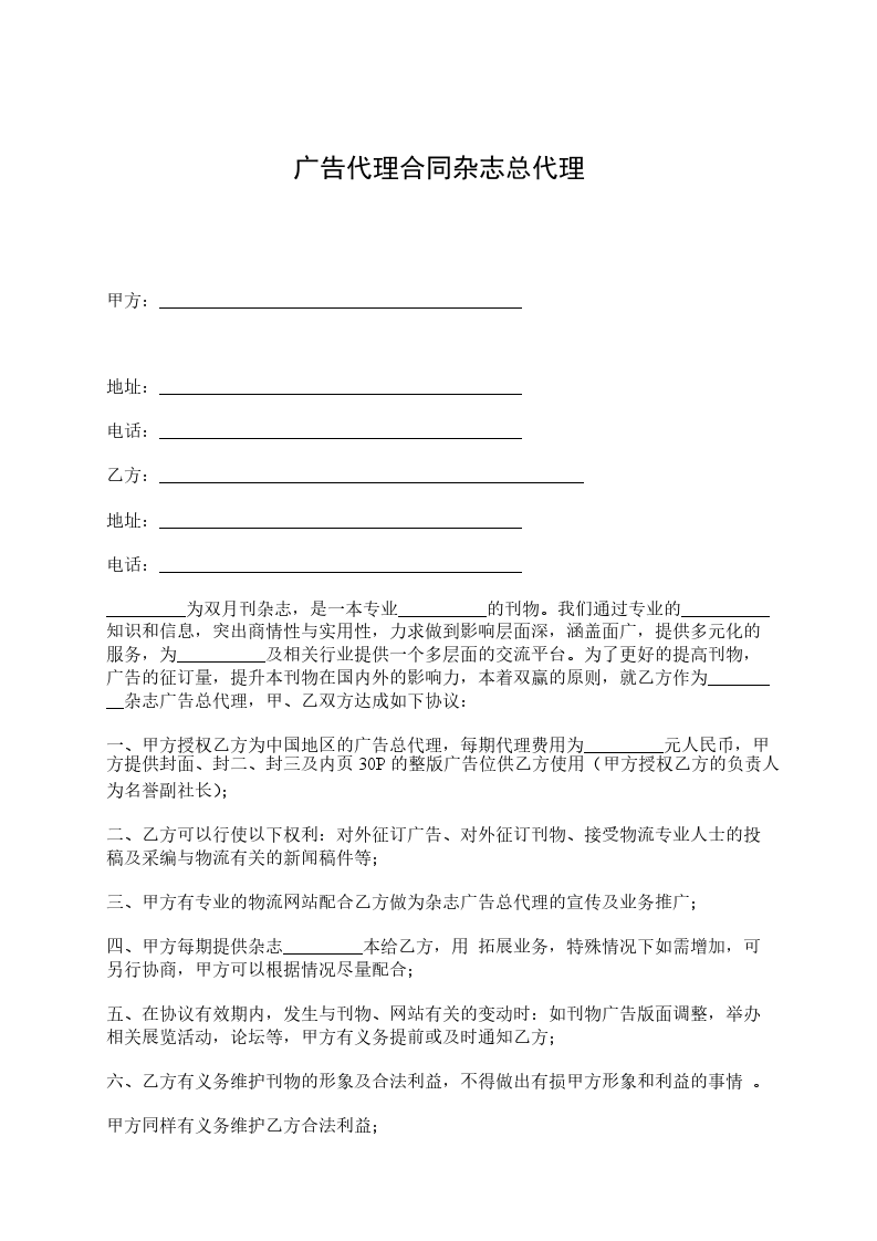 1、_________为双月刊杂志,是一本专业物流的刊物。我们通过专业的物流知识和信息,突出商情性与实用性,力求做到影响层面深,涵盖面广,提供多元化的服务,为物流及相关行业提供一个多层面的交流平台。为了更好的提高刊物,广告的征订量,提升本刊物在国内外的影响力,本着双赢的原则,就乙方作为_________杂志广告总代理,甲、乙双方达成如下协议: