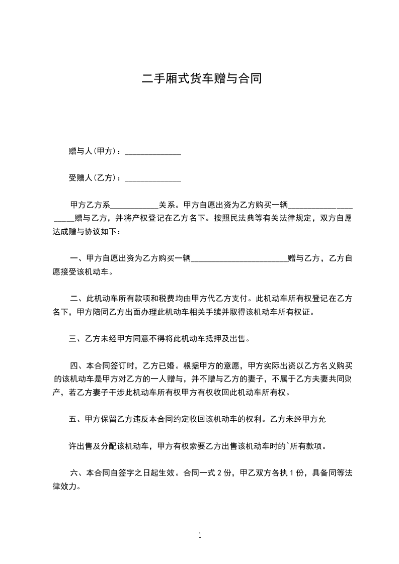一、甲方自愿出资为乙方购买一辆________________________赠与乙方,乙方自愿接受该机动车。