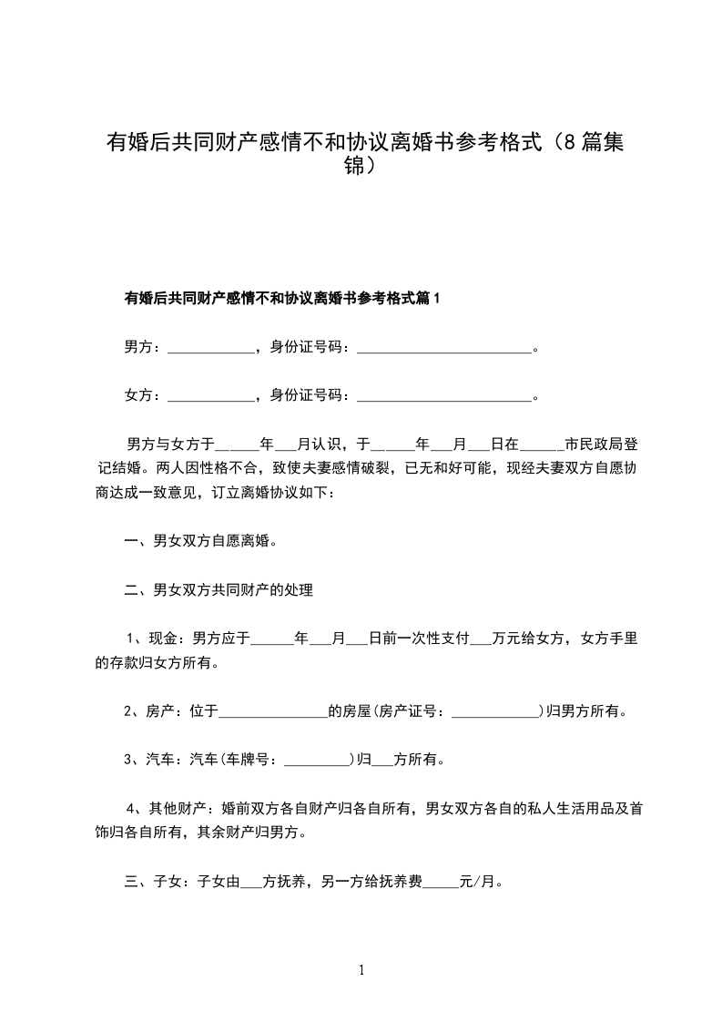 有婚后共同财产感情不和协议离婚书参考格式篇7