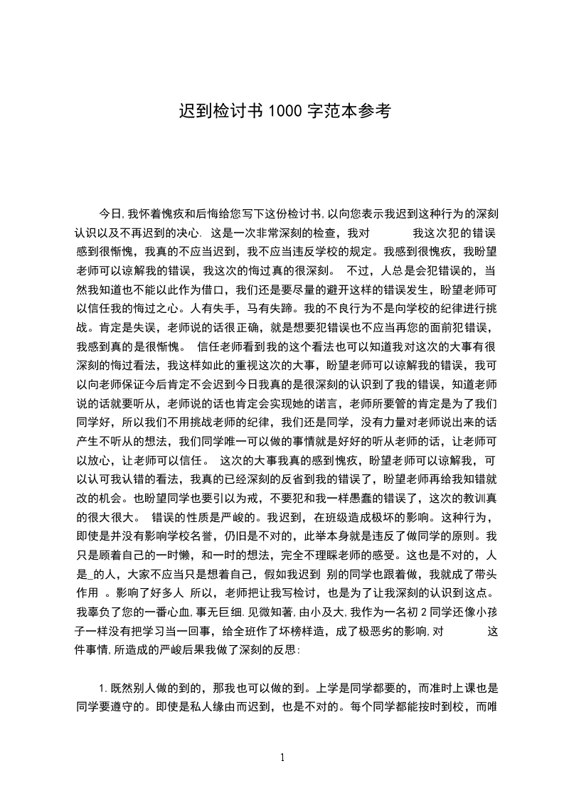 1.既然别人做的到的,那我也可以做的到。上学是同学都要的,而准时上课也是同学要遵守的。即使是私人缘由而迟到,也是不对的。每个同学都能按时到校,而唯独我特别,说明我还是不够仔细,把上学当一回事。我感到非常的内疚。我应当努力克服懒散,而不是把家远,闹钟坏了当借口。 2这件事也.影响个人综合水平的提高,使自身在本能提高的条件下为能提高.如今错已铸成,我深感后悔,深刻检讨自己的错误. 作为迟到的一份子,我觉得有必要对我们的行为作出检讨,所以根据老师的要求激纳保质保量的检讨书一份.对自己的错误根源进行深挖细找的整理,并认清可能造成的严峻后果. 望老师能念在我认识深刻而且平常表现也不错的份上,从轻处理,请关怀爱惜我的老师同学连续监督,关心我改正缺点,取得更大的进步. 今后我肯定会好好学习,不在迟到,并且主动为班级做贡献,为班级添光荣!请老师信任我! : 上班迟到检讨书 字范本推举开会迟到300字简洁版的检讨书_因迟到要写检讨书学校生上课迟到检讨书_三篇学校生军训迟到检讨书_上课迟到检讨书1000字_公司迟到检讨书_ 迟到早退检讨书精选_部门例会迟到检讨书关 开会迟到检讨书500字 1/5