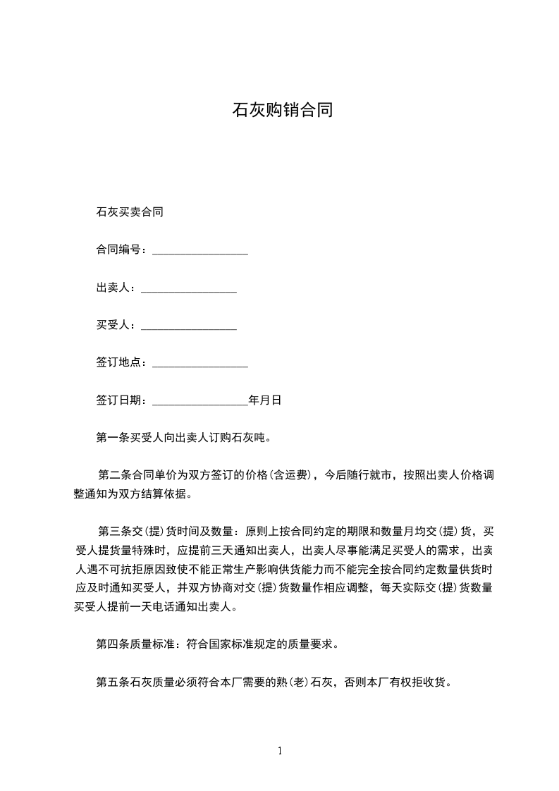 第一条买受人向出卖人订购石灰吨。
