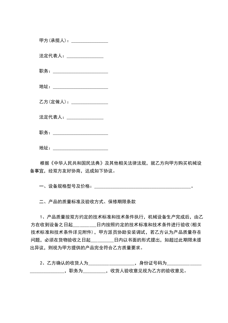根据《中华人民共和国民法典》及其他相关法律法规,就乙方向甲方购买机械设备事宜,经双方友好协商,达成如下协议。