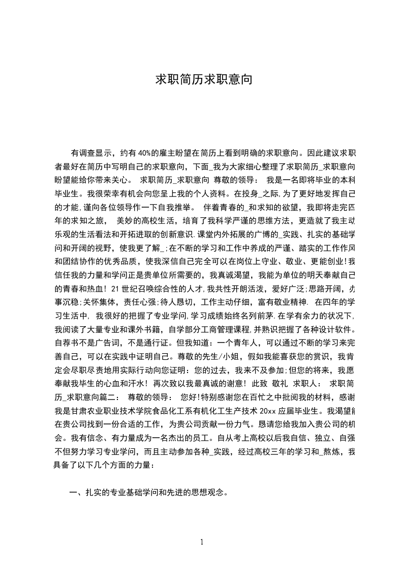 有调查显示,约有40%的雇主盼望在简历上看到明确的求职意向。因此建议求职者最好在简历中写明自己的求职意向,下面_我为大家细心整理了求职简历_求职意向,盼望能给你带来关心。 求职简历_求职意向 尊敬的领导: 我是一名即将毕业的本科毕业生。我很荣幸有机会向您呈上我的个人资料。在投身_之际,为了更好地发挥自己的才能,谨向各位领导作一下自我推举。 伴着青春的_和求知的欲望,我即将走完四年的求知之旅, 美妙的高校生活,培育了我科学严谨的思维方法,更造就了我主动乐观的生活看法和开拓进取的创新意识.课堂内外拓展的广博的_实践、扎实的基础学问和开阔的视野,使我更了解_;在不断的学习和工作中养成的严谨、踏实的工作作风和团结协作的优秀品质,使我深信自己完全可以在岗位上守业、敬业、更能创业!我信任我的力量和学问正是贵单位所需要的,我真诚渴望,我能为单位的明天奉献自己的青春和热血! 21世纪召唤综合性的人才,我共性开朗活泼,爱好广泛;思路开阔,办事沉稳;关怀集体,责任心强;待人恳切,工作主动仔细,富有敬业精神. 在四年的学习生活中, 我很好的把握了专业学问,学习成绩始终名列前茅.在学有余力的状况下,我阅读了大量专业和课外书籍,自学部分工商管理课程,并熟识把握了各种设计软件。 自荐书不是广告词,不是通行证。但我知道:一个青年人,可以通过不断的学习来完善自己,可以在实践中证明自己。尊敬的先生/小姐,假如我能喜获您的赏识,我肯定会尽职尽责地用实际行动向您证明:您的过去,我来不及参加;但您的将来,我愿奉献我毕生的心血和汗水! 再次致以我最真诚的谢意! 此致 敬礼 求职人: 求职简历_求职意向篇二: 尊敬的领导: 您好!特别感谢您在百忙之中批阅我的材料,感谢! 我是甘肃农业职业技术学院食品化工系有机化工生产技术20xx应届毕业生。我渴望能在贵公司找到一份合适的工作,为贵公司贡献一份力气。恳请您给我加入贵公司的机会。我有信念、有力量成为一名杰出的员工。自从考上高校以后我自信、独立、自强,不但努力学习专业学问,而且主动参加各种_实践,经过高校三年的学习和_熬炼,我具备了以下几个方面的力量:
