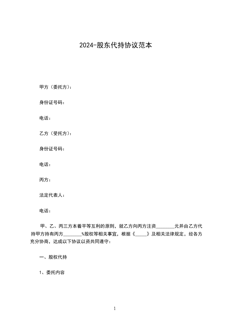 甲、乙、丙三方本着平等互利的原则,就乙方向丙方注资________元并由乙方代持甲方持有丙方________%股权等相关事宜,根据《_____》及相关法律规定,经各方充分协商,达成以下协议以资共同遵守: