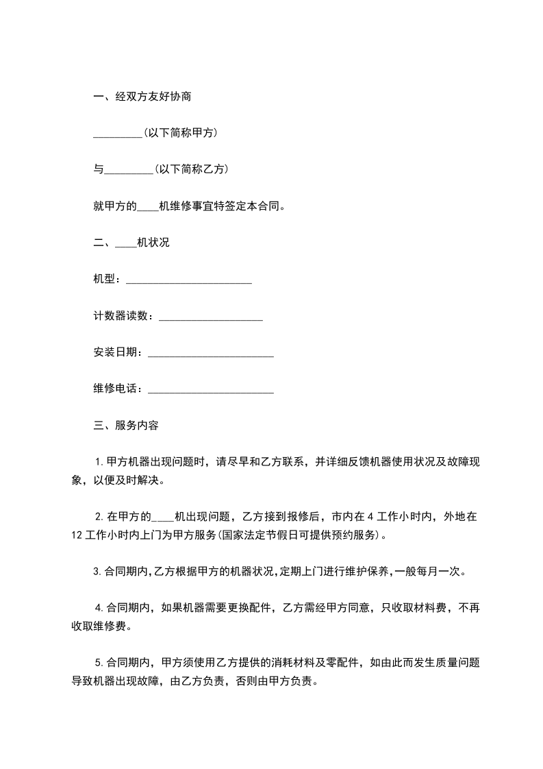 4.合同期内,如果机器需要更换配件,乙方需经甲方同意,只收取材料费,不再收取维修费。