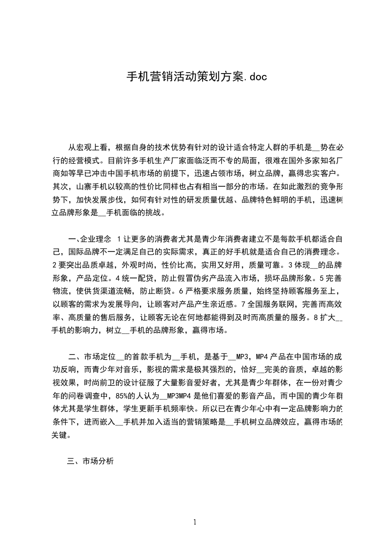 七、营销计划营销导入导入原则:从市场,电视,网络.杂志等媒体进行立体式广告投放的同时,进行__品牌的推广.针对不同的人群进行其功能特色的宣传.以下是几种营销策略。策略1:以“__,你的贴心朋友”为主题进入校园,设立体验中心并以其特色功能举办相应活动.例如__音乐功能强大,可以举办“__杯,唱出我的心声”校园歌手大赛,歌曲创作大赛,红歌合喝大赛等多校联合并以晋级赛方式的比赛提高影响力。可行性分析:处于青春期的学生喜欢音乐,渴望独立,心里有很多想法渴望得到别人认可。以“__唱出我的心声”为主题,很让他们有亲切和认同感,加上体验很容易让他们接受__。__目前的广告主要以电视方式宣传,而学生的大部分时间都在校园,很难接触电视广告。这种走进校园,亲身体验卓越功能宣传效果更强,更具有针对性,广告支出更低,更能达到良好的宣传效果。策略2:__手机有一项特色功能“我的学习”其主要为英语学习功能,可以利用此功能举办“校园词霸大赛”“英语口语大赛”并在教育电视台播出,邀请媒体记者参加。通过媒体的宣传提高其知名度,尤其是向家长老师宣传,__手机不仅仅是娱乐化的手机而且还带有学习功能的手机。向他们传达一个理念,正确的学习方法是劳逸结合。从而让老师和学生家长对__手机认可!可行性分析:老师和家长最重视的是学习,举办关于学习的比赛必定能得到老师和学校的大力支持,而政府也越来越注重学生的综合发展,必然能引起教育媒体的关注和支持,而这些媒体广而有力的宣传必然能快速提升__的知名度。而__之前的广告很少涉及学习这方面的宣传,该活动必然能引起强烈反响。策略3:在学校举行以__为赞助的相关活动时,对参赛人员和观众进行以“我最喜欢的手机”问卷调查,从外观及功能等方面进行调查,然后进行统计并反馈到市场分析部,以为公司的下一步发展计划作为重要参考依据。每位参与问卷调查的同学都会赠与印有__商标和特色的学习用品,如笔、记事本等。可行性分析;学生都愿意参加这种有趣的调查,因为在他们心中都有一个完美手机的构想。希望可以表达出来,并且还可以获赠精美的小礼品。此项调查应该可以取得成功。而且印有__的小礼品也是一种较为持久的广告品牌宣传。