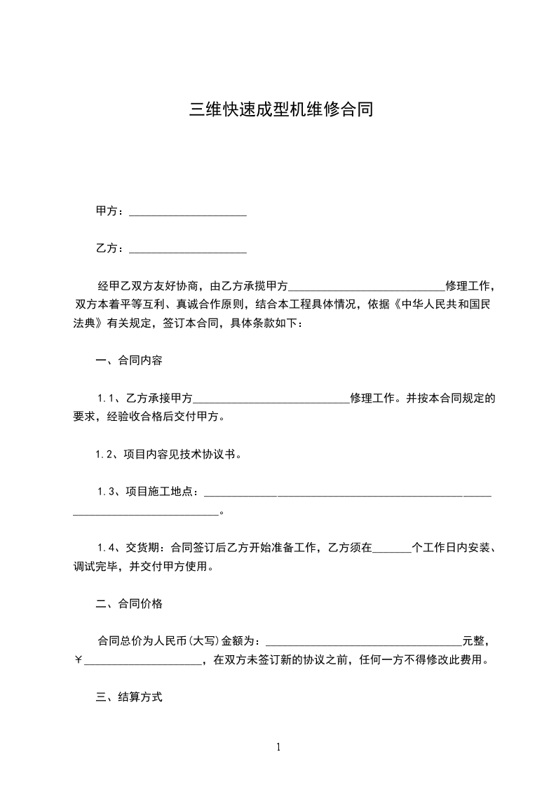 1.1、乙方承接甲方____________________________修理工作。并按本合同规定的要求,经验收合格后交付甲方。