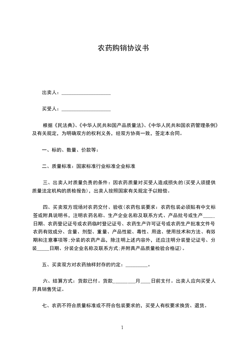 五、结算方式:预付总货款的_____%,待乙方收货并验收后付%,农药使用后十五天内付清余款。