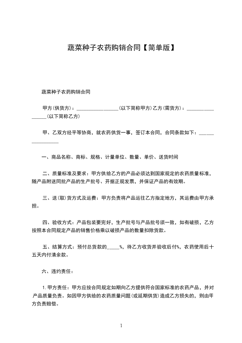 1.甲方责任:甲方应按合同规定如期向乙方提供符合国家标准的农药产品,并对产品质量负责。如因甲方供给的农药质量问题(或延期供货)造成乙方损失的,则由甲方负责赔偿。
