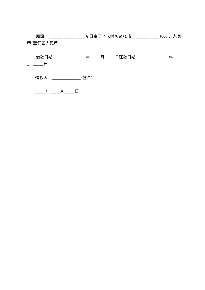 原因:_________________今日由于个人财务紧张借_____________1000元人民币(壹仟圆人民币)
