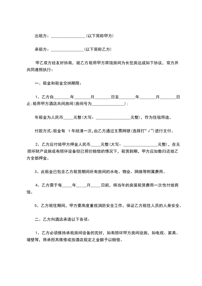 甲乙双方经友好协商,就乙方租用甲方宾馆房间为长住房达成如下协议,双方并共同遵照执行:
