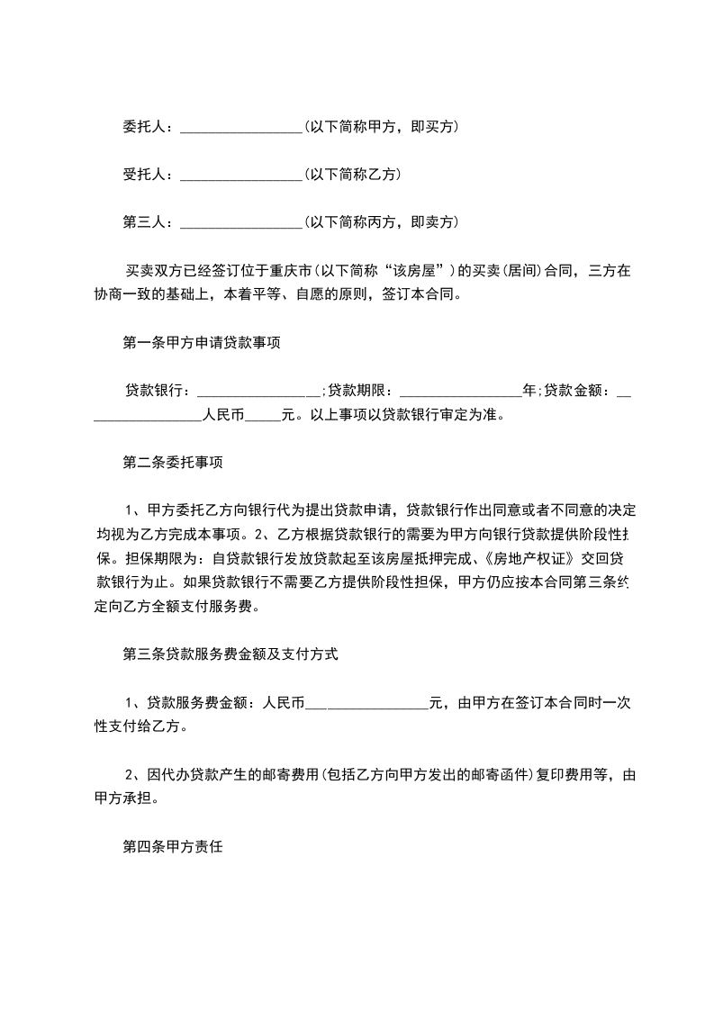 1、甲方委托乙方向银行代为提出贷款申请,贷款银行作出同意或者不同意的决定均视为乙方完成本事项。2、乙方根据贷款银行的需要为甲方向银行贷款提供阶段性担保。担保期限为:自贷款银行发放贷款起至该房屋抵押完成、《房地产权证》交回贷款银行为止。如果贷款银行不需要乙方提供阶段性担保,甲方仍应按本合同第三条约定向乙方全额支付服务费。