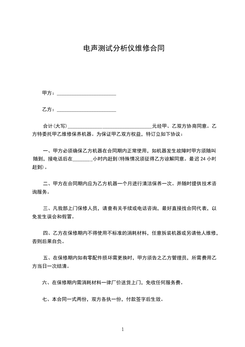 合计(大写)__________________________________元经甲、乙双方协商同意。乙方特委托甲乙维修保养机器。为保证甲乙双方权益,特订立如下协议: