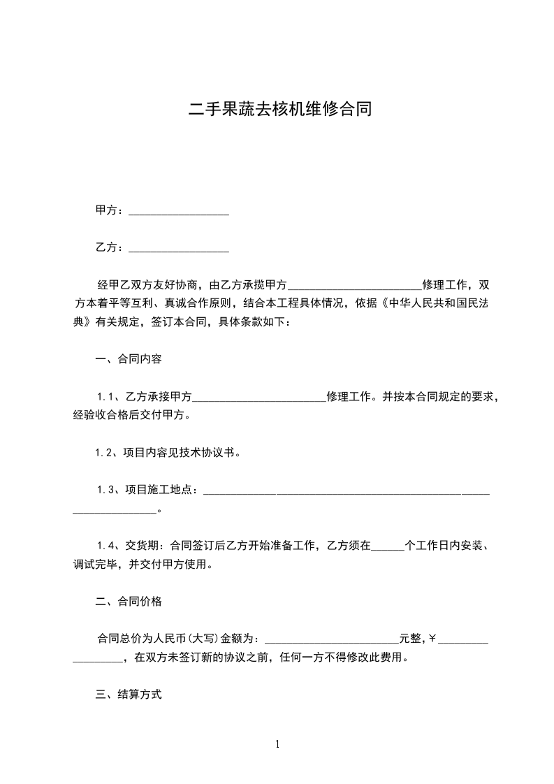 1.1、乙方承接甲方________________________修理工作。并按本合同规定的要求,经验收合格后交付甲方。