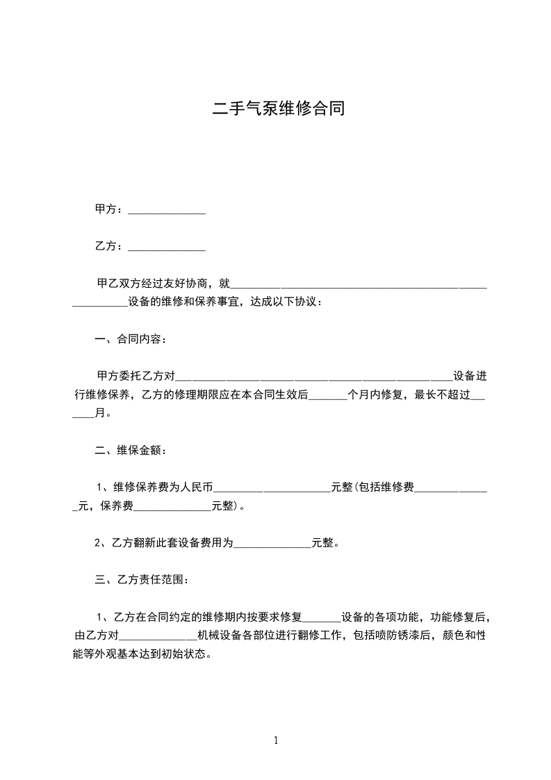 1、为了保障甲方______________设备的正常使用,合同期间内,乙方定期为甲方的_____________________设备进行维修保养,定期______________天保养一次。
