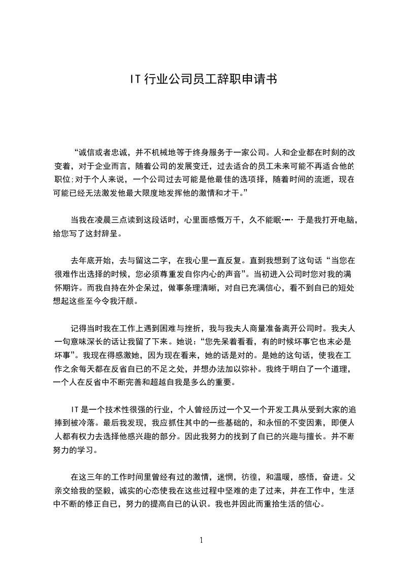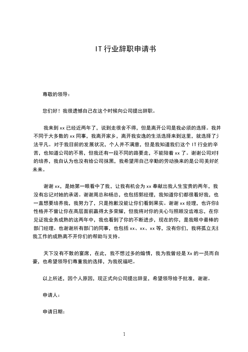 我来到xx已经近两年了,说到走很舍不得,但是离开公司是我必须的选择。我并不同于大多数的xx同事,我离开家乡,离开我安逸的生活选择来到这里,就选择了无法平凡。对于我目前的发展状况,个人并不满意,但是我知道我们这个IT行业的辛苦,也知道公司的不易,但我还有一段不同的路要走,不能陪着xx了。谢谢公司对我的培养,我自认为也没有给公司抹黑,我希望用自己辛勤的劳动换来的是公司美好的未来。