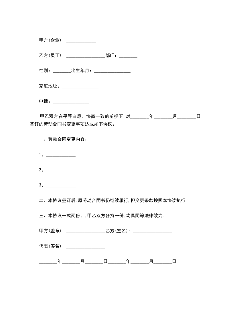甲乙双方在平等自愿、协商一致的前提下,对________年________月________日签订的劳动合同书变更事项达成如下协议: