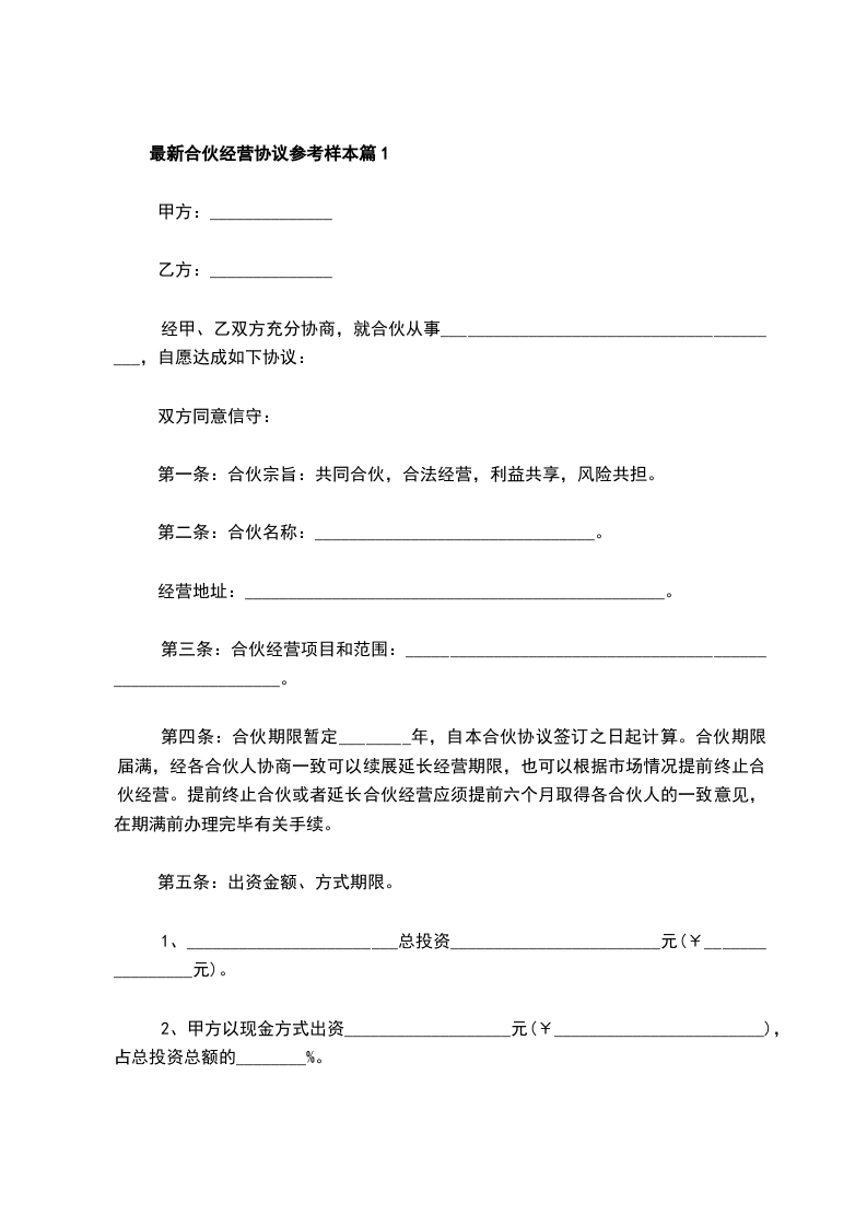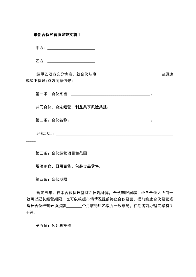 暂定五年,自本合伙协议签订之日起计算,合伙期限届满,经各合伙人协商一致可以延长经营期限,也可以根据市场情况提前终止合伙经营,提前终止合伙经营或延长合伙经营必须提前________个月取得甲乙双方一致意见,在期满前办理完毕有关手续。