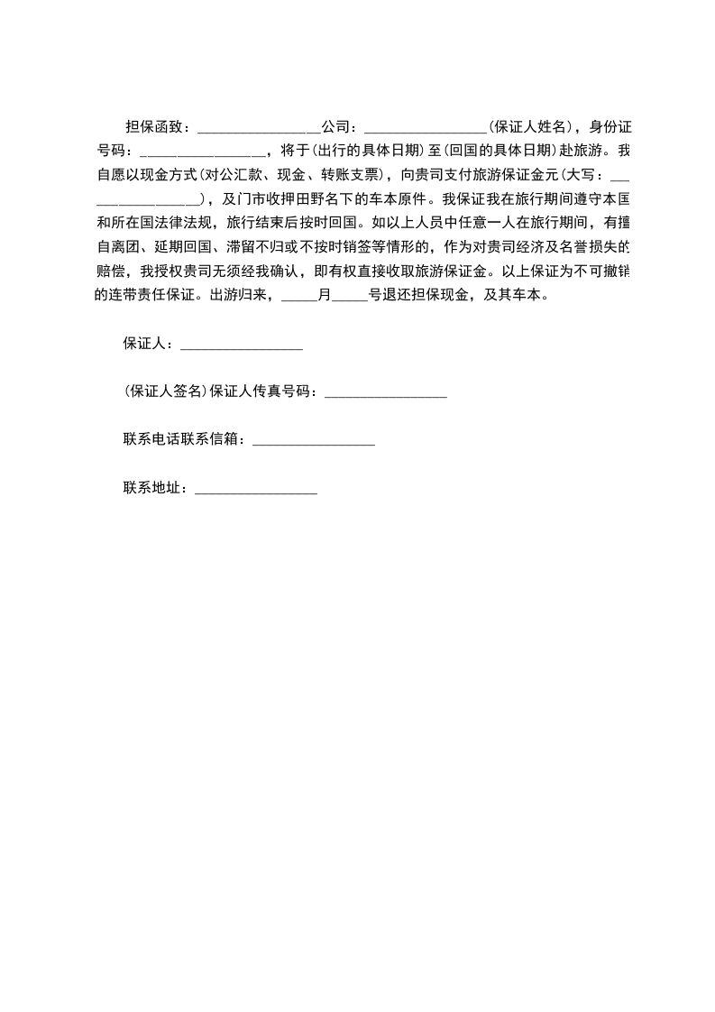 担保函致:_________________公司:_________________(保证人姓名),身份证号码:_________________,将于(出行的具体日期)至(回国的具体日期)赴旅游。我自愿以现金方式(对公汇款、现金、转账支票),向贵司支付旅游保证金元(大写:_________________),及门市收押田野名下的车本原件。我保证我在旅行期间遵守本国和所在国法律法规,旅行结束后按时回国。如以上人员中任意一人在旅行期间,有擅自离团、延期回国、滞留不归或不按时销签等情形的,作为对贵司经济及名誉损失的赔偿,我授权贵司无须经我确认,即有权直接收取旅游保证金。以上保证为不可撤销的连带责任保证。出游归来,_____月_____号退还担保现金,及其车本。