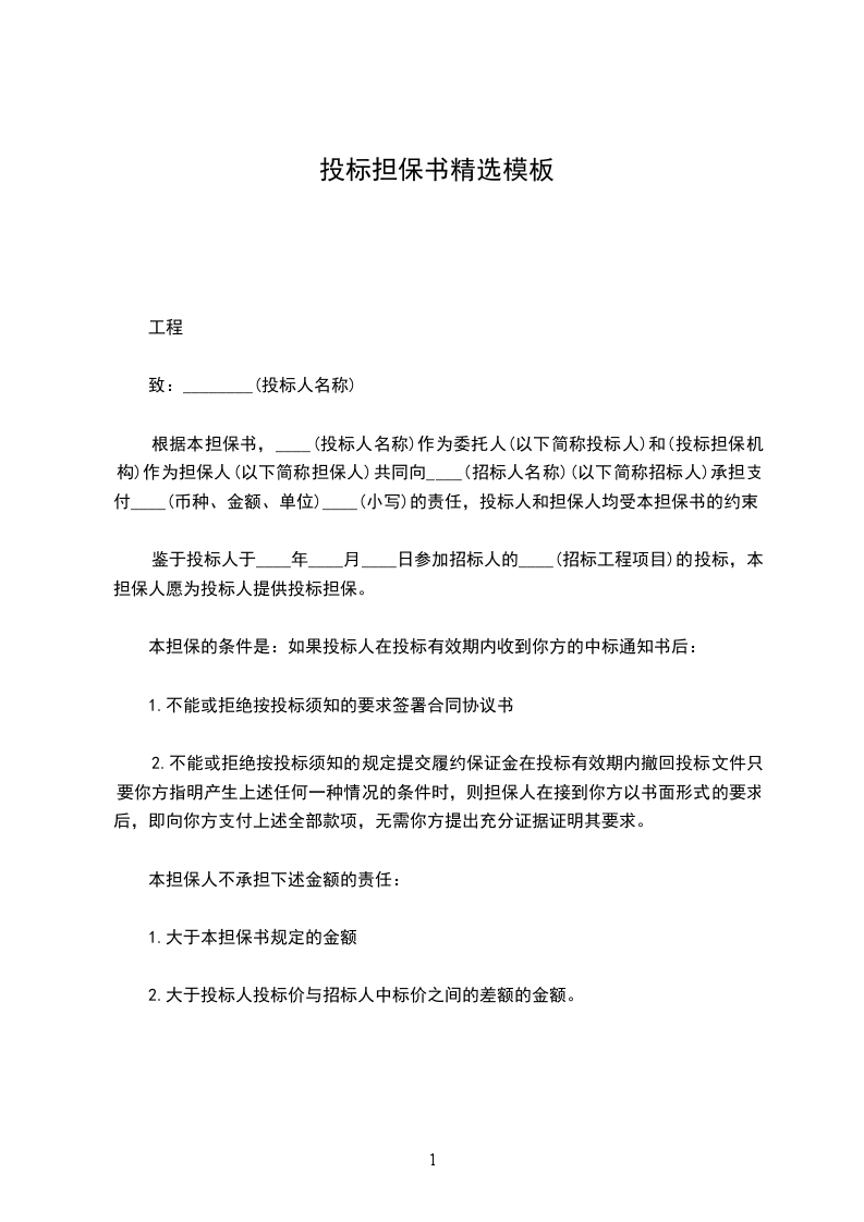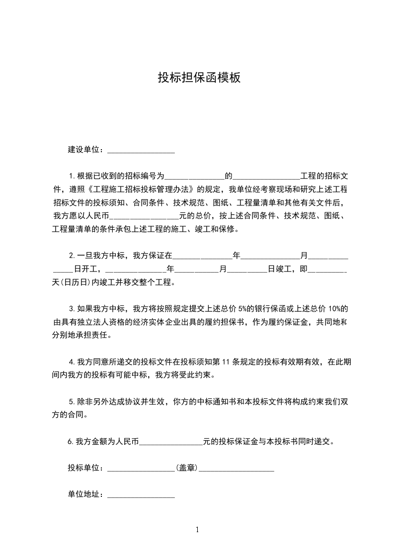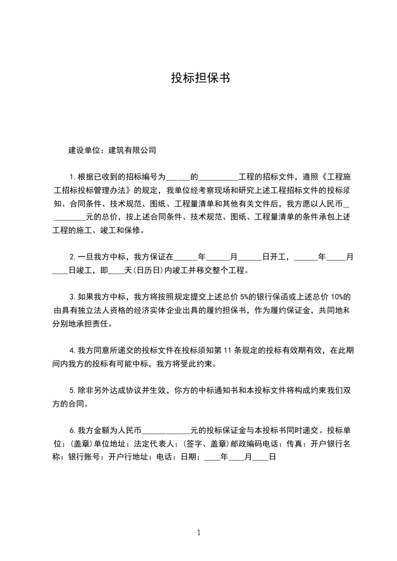 1.根据已收到的招标编号为_______________的_________________工程的招标文件,遵照《工程施工招标投标管理办法》的规定,我单位经考察现场和研究上述工程招标文件的投标须知、合同条件、技术规范、图纸、工程量清单和其他有关文件后,我方愿以人民币_________________元的总价,按上述合同条件、技术规范、图纸、工程量清单的条件承包上述工程的施工、竣工和保修。