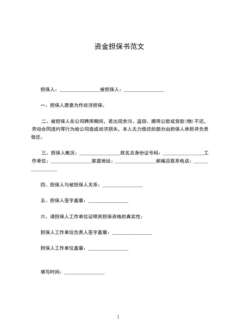 三、担保人概况:_________________姓名及身份证号码:_________________工作单位:_________________家庭地址:_________________邮编及联系电话:_________________
