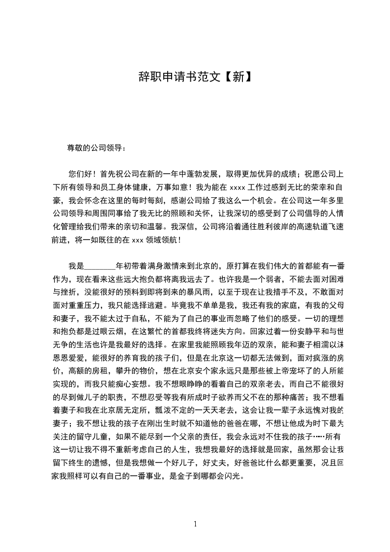 我是________年初带着满身激情来到北京的,原打算在我们伟大的首都能有一番作为,现在看来这些远大抱负都将离我远去了。也许我是一个弱者,不能去面对困难与挫折,没能很好的预料到即将到来的暴风雨,以至于现在让我措手不及,不敢面对,面对重重压力,我只能选择逃避。毕竟我不单单是我,我还有我的家庭,有我的父母和妻子,我不能太过于自私,不能为了自己的事业而忽略了他们的感受。一切的理想和抱负都是过眼云烟,在这繁忙的首都我终将迷失方向。回家过着一份安静平和与世无争的生活也许是我最好的选择。在家里我能照顾我年迈的双亲,能和妻子相濡以沫恩恩爱爱,能很好的养育我的孩子们,但是在北京这一切都无法做到,面对疯涨的房价,高额的房租,攀升的物价,想在北京安个家永远只是那些被上帝宠坏了的人所能实现的,而我只能痴心妄想。我不想眼睁睁的看着自己的双亲老去,而自己不能很好的尽到做儿子的职责,不想忍受等我有所成时子欲养而父不在的那种痛苦;我不想看着妻子和我在北京居无定所,瓢泼不定的一天天老去,这会让我一辈子永远愧对我的妻子;我不想让我的孩子在刚出生时就不知道他的爸爸在哪,不想让他成为时下最为关注的留守儿童,如果不能尽到一个父亲的责任,我会永远对不住我的孩子……所有这一切让我不得不重新考虑自己的人生,我想我最好的选择就是回家,虽然那会让我留下终生的遗憾,但是我想做一个好儿子,好丈夫,好爸爸比什么都更重要,况且回家我照样可以有自己的一番事业,是金子到哪都会闪光。