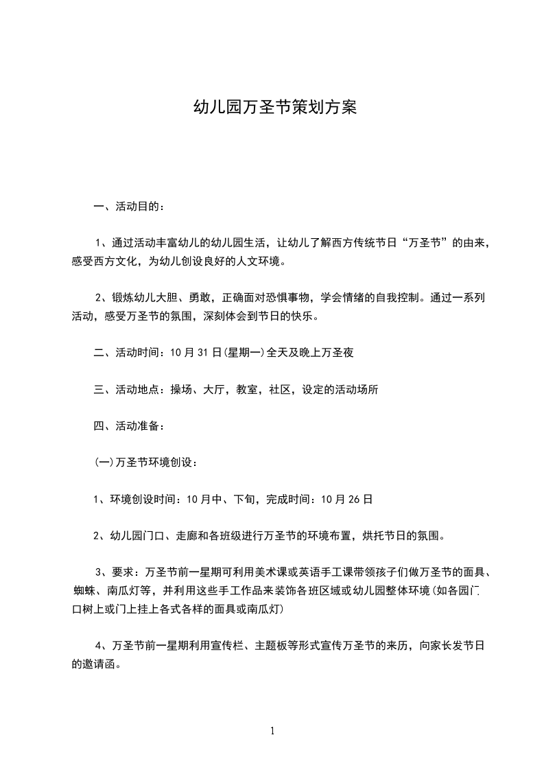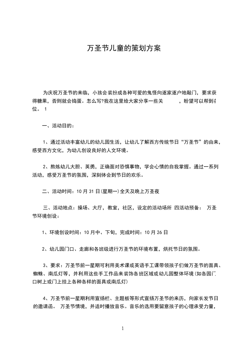 3、不管是游园形式、讨糖活动还是酒会、舞会形式的万圣节活动肯定要做好平安防护工作及活动前的预备工作,让幼儿明白活动意义。 2 万圣节流传到今日成了一个孩子们的节日,也是年轻人化妆舞会的节日,它已经完全没有了宗教迷信颜色。为了让孩子感受西方的文化和体验嬉戏的欢乐,结合园所的英语特色,特设计此活动方案: 老师幼儿角色大变装:全部老尸(师)以及参与嬉戏的家长小伴侣们应自己在家装扮好来参与活动。如:哈利波特、白雪公主、米奇、小精灵、幽灵、僵尸等。