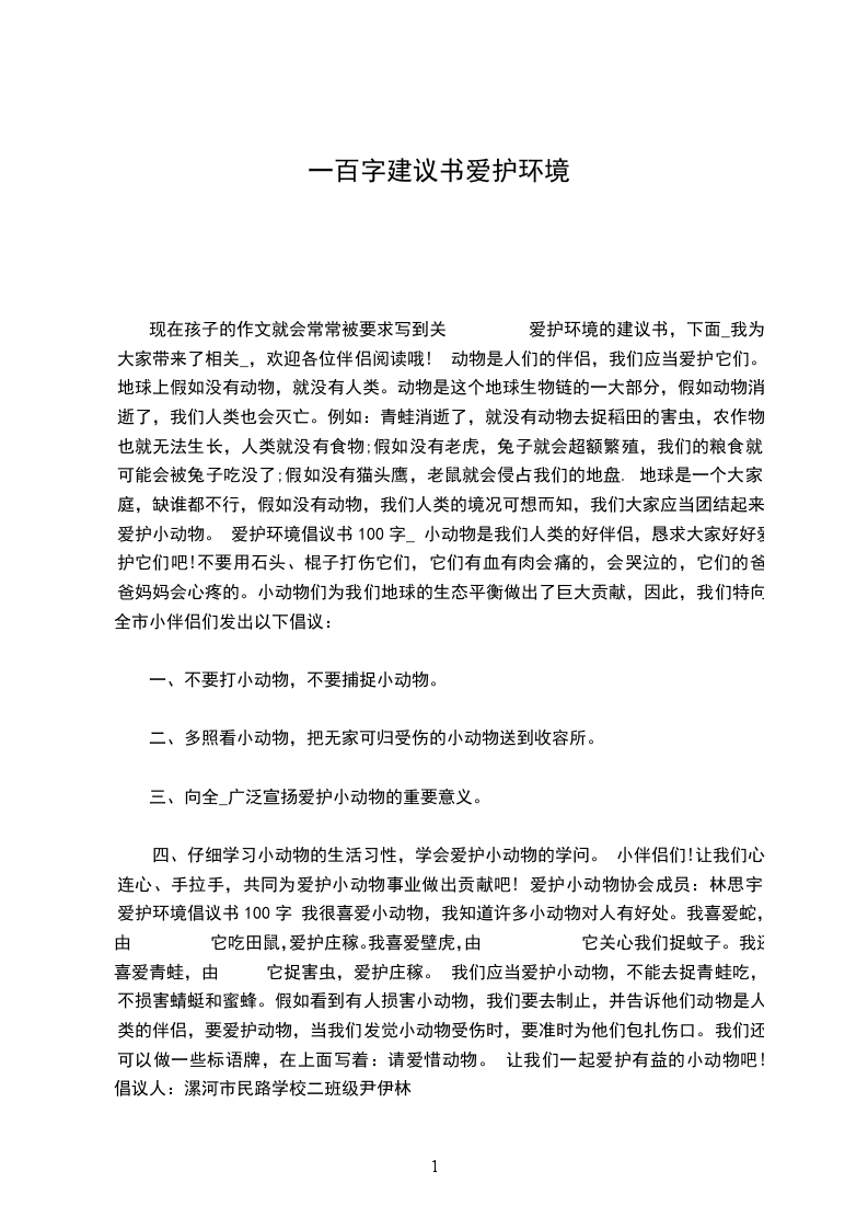 四、仔细学习小动物的生活习性,学会爱护小动物的学问。 小伴侣们!让我们心连心、手拉手,共同为爱护小动物事业做出贡献吧! 爱护小动物协会成员:林思宇 爱护环境倡议书100字 我很喜爱小动物,我知道许多小动物对人有好处。我喜爱蛇,由 它吃田鼠,爱护庄稼。我喜爱壁虎,由 它关心我们捉蚊子。我还喜爱青蛙,由 它捉害虫,爱护庄稼。 我们应当爱护小动物,不能去捉青蛙吃,不损害蜻蜓和蜜蜂。假如看到有人损害小动物,我们要去制止,并告诉他们动物是人类的伴侣,要爱护动物,当我们发觉小动物受伤时,要准时为他们包扎伤口。我们还可以做一些标语牌,在上面写着:请爱惜动物。 让我们一起爱护有益的小动物吧! 倡议人:漯河市民路学校二班级尹伊林