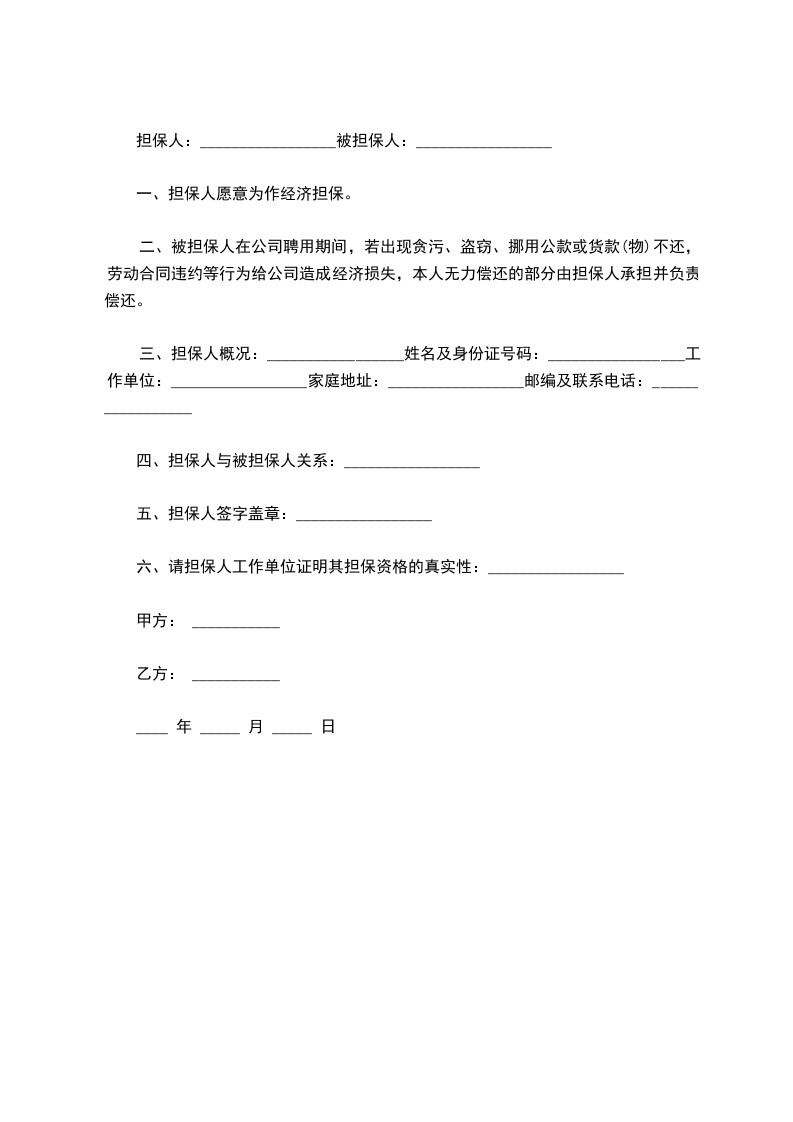 二、被担保人在公司聘用期间,若出现贪污、盗窃、挪用公款或货款(物)不还,劳动合同违约等行为给公司造成经济损失,本人无力偿还的部分由担保人承担并负责偿还。