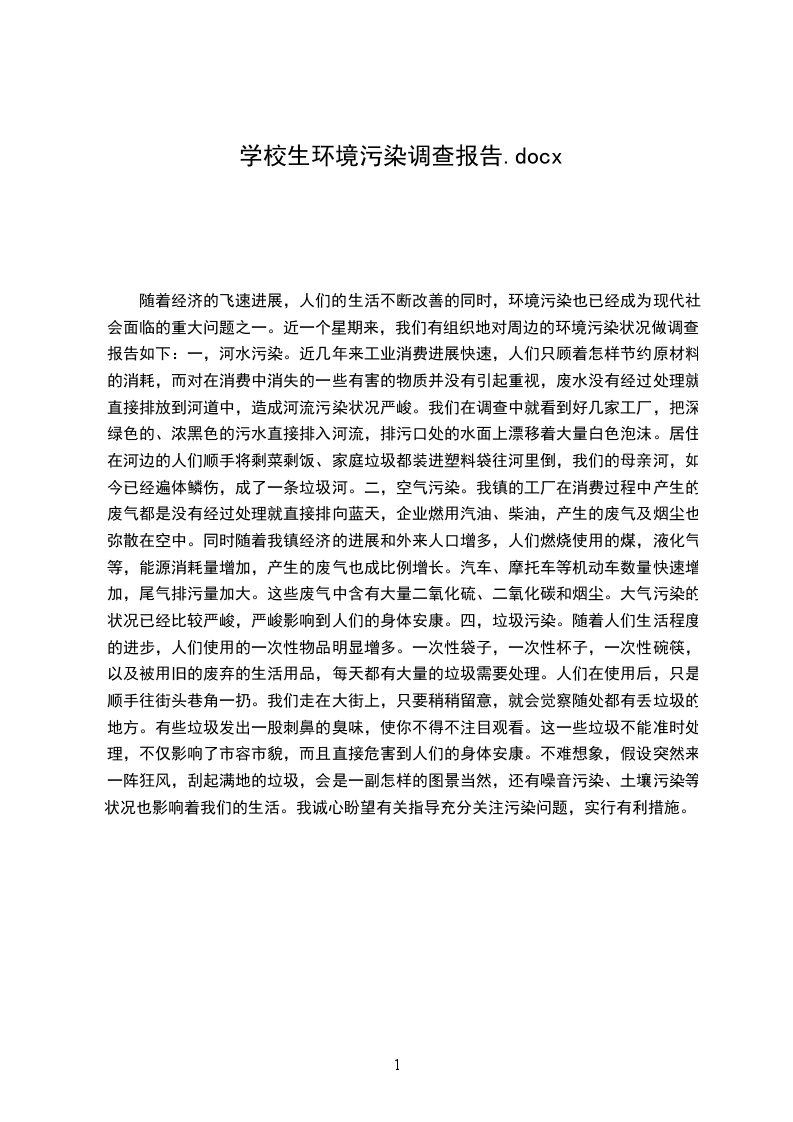 随着经济的飞速进展,人们的生活不断改善的同时,环境污染也已经成为现代社会面临的重大问题之一。近一个星期来,我们有组织地对周边的环境污染状况做调查,报告如下:一,河水污染。近几年来工业消费进展快速,人们只顾着怎样节约原材料的消耗,而对在消费中消失的一些有害的物质并没有引起重视,废水没有经过处理就直接排放到河道中,造成河流污染状况严峻。我们在调查中就看到好几家工厂,把深绿色的、浓黑色的污水直接排入河流,排污口处的水面上漂移着大量白色泡沫。居住在河边的人们顺手将剩菜剩饭、家庭垃圾都装进塑料袋往河里倒,我们的母亲河,如今已经遍体鳞伤,成了一条垃圾河。二,空气污染。我镇的工厂在消费过程中产生的废气都是没有经过处理就直接排向蓝天,企业燃用汽油、柴油,产生的废气及烟尘也弥散在空中。同时随着我镇经济的进展和外来人口增多,人们燃烧使用的煤,液化气等,能源消耗量增加,产生的废气也成比例增长。汽车、摩托车等机动车数量快速增加,尾气排污量加大。这些废气中含有大量二氧化硫、二氧化碳和烟尘。大气污染的状况已经比较严峻,严峻影响到人们的身体安康。四,垃圾污染。随着人们生活程度的进步,人们使用的一次性物品明显增多。一次性袋子,一次性杯子,一次性碗筷,以及被用旧的废弃的生活用品,每天都有大量的垃圾需要处理。人们在使用后,只是顺手往街头巷角一扔。我们走在大街上,只要稍稍留意,就会觉察随处都有丢垃圾的地方。有些垃圾发出一股刺鼻的臭味,使你不得不注目观看。这一些垃圾不能准时处理,不仅影响了市容市貌,而且直接危害到人们的身体安康。不难想象,假设突然来一阵狂风,刮起满地的垃圾,会是一副怎样的图景当然,还有噪音污染、土壤污染等状况也影响着我们的生活。我诚心盼望有关指导充分关注污染问题,实行有利措施。