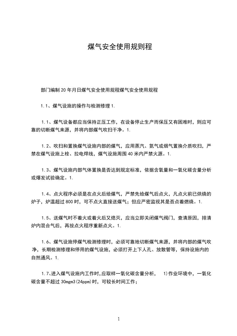 1.6、煤气设施停煤气检测修理时,必须可靠地切断煤气来源,并将内部的煤气吹净,长期检测修理和停用的煤气设施,必须打开上下人孔、放散管等,保持设施内的自然通风。1.