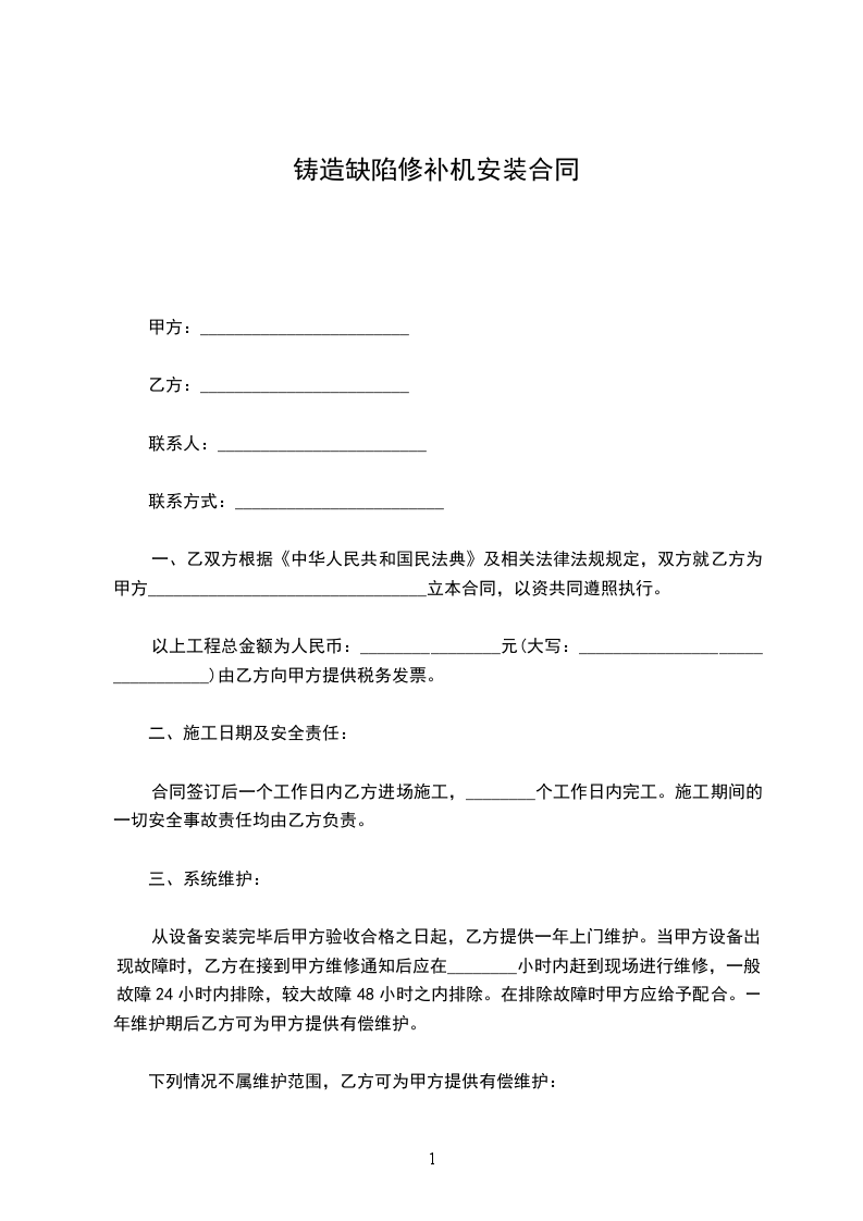 二手铸造缺陷修补机运输合同