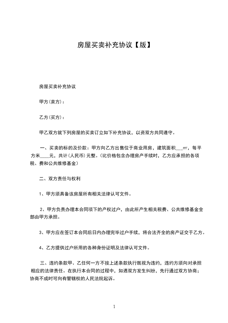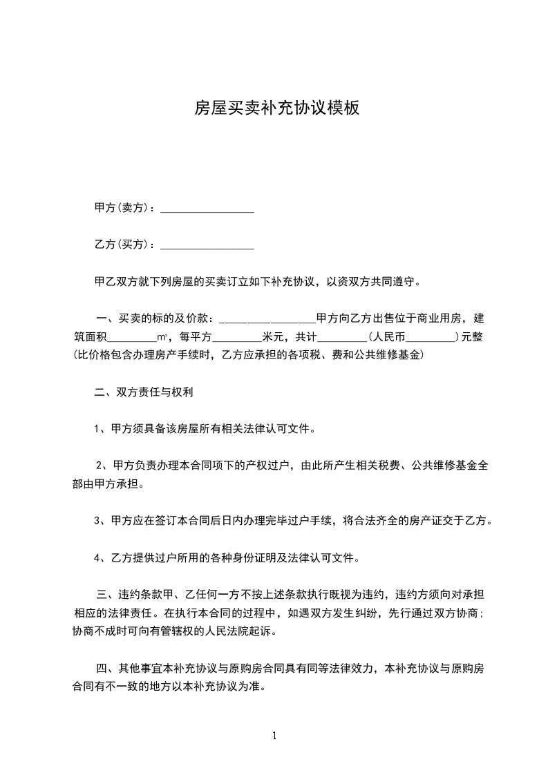 一、买卖的标的及价款:_________________甲方向乙方出售位于商业用房,建筑面积_________㎡,每平方_________米元,共计_________(人民币_________)元整。(比价格包含办理房产手续时,乙方应承担的各项税、费和公共维修基金)