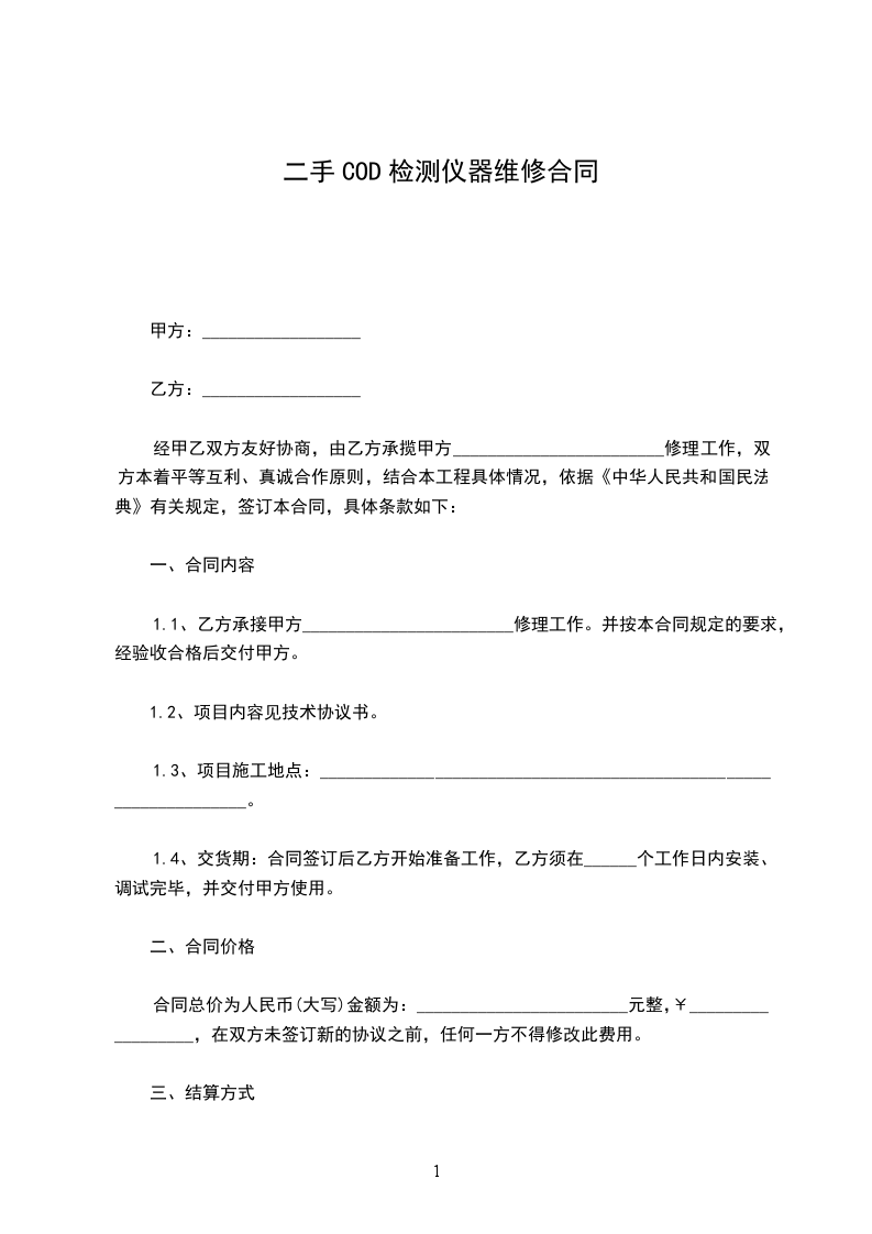1.1、乙方承接甲方________________________修理工作。并按本合同规定的要求,经验收合格后交付甲方。