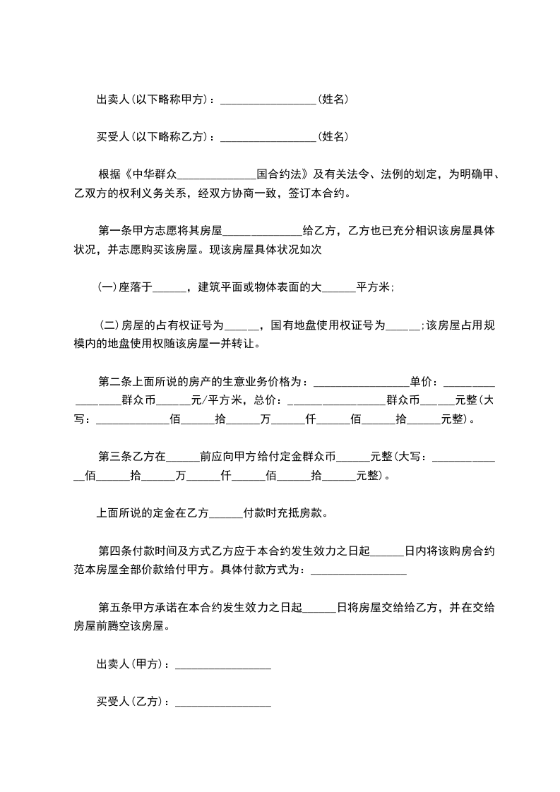 第一条甲方志愿将其房屋______________给乙方,乙方也已充分相识该房屋具体状况,并志愿购买该房屋。现该房屋具体状况如次