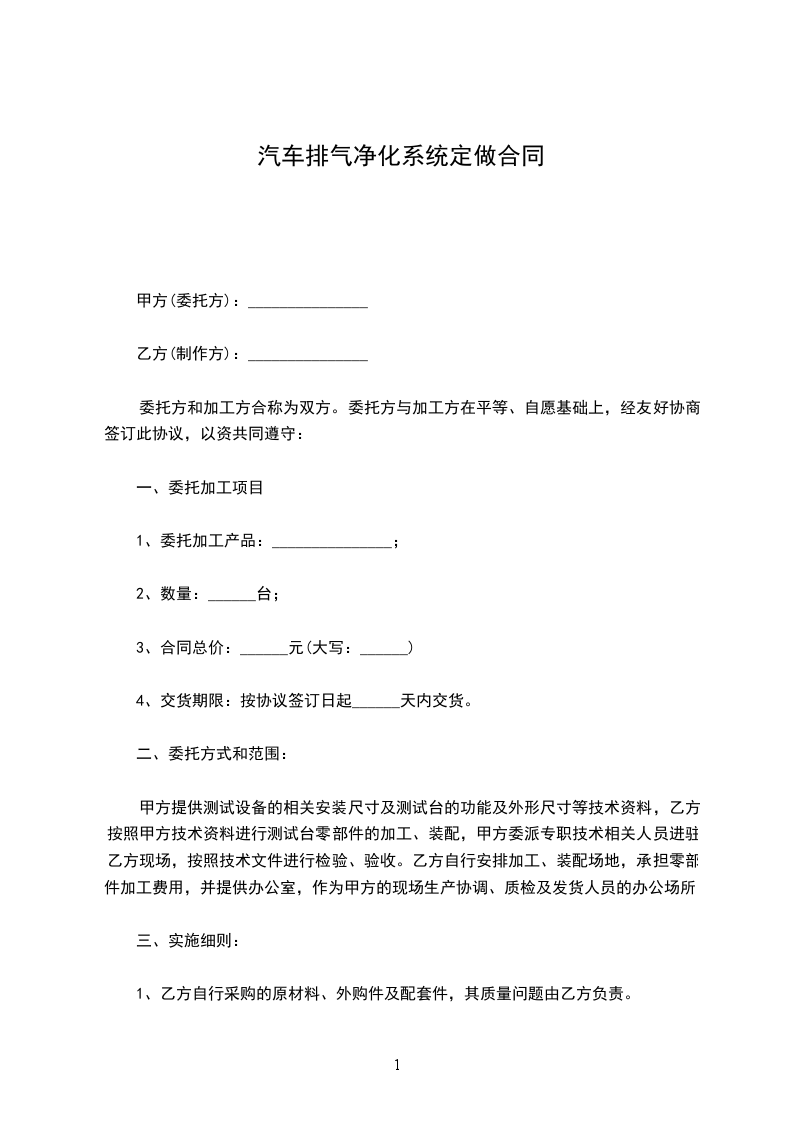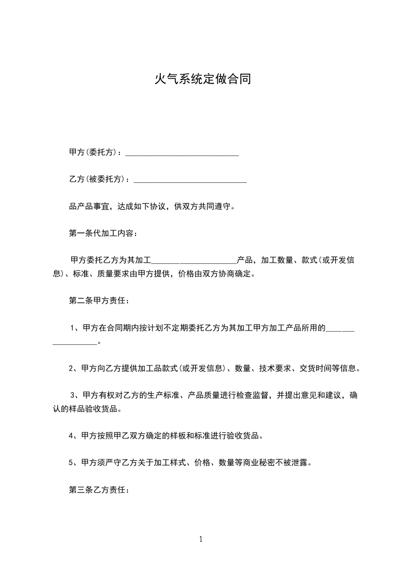 甲方委托乙方为其加工_____________________产品,加工数量、款式(或开发信息)、标准、质量要求由甲方提供,价格由双方协商确定。