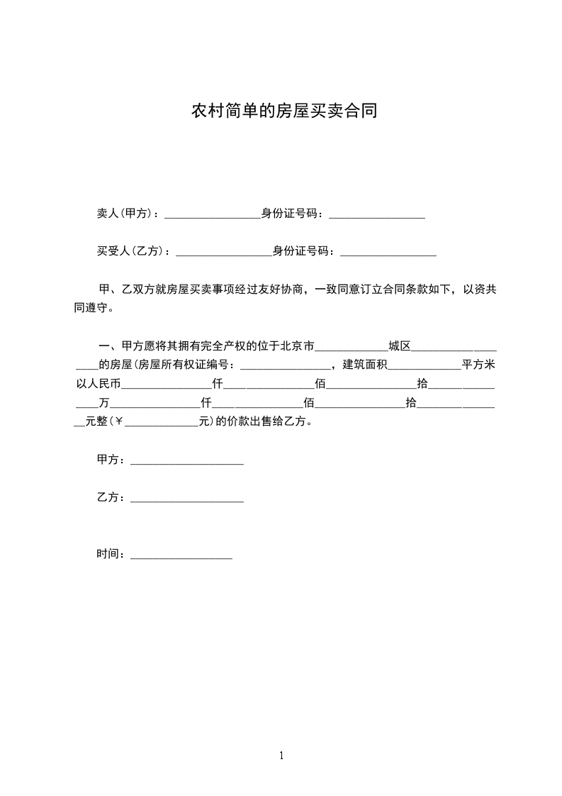 一、甲方愿将其拥有完全产权的位于北京市_____________城区___________________的房屋(房屋所有权证编号:________________,建筑面积_____________平方米)以人民币________________仟________________佰________________拾________________万________________仟________________佰________________拾________________元整(¥_____________元)的价款出售给乙方。