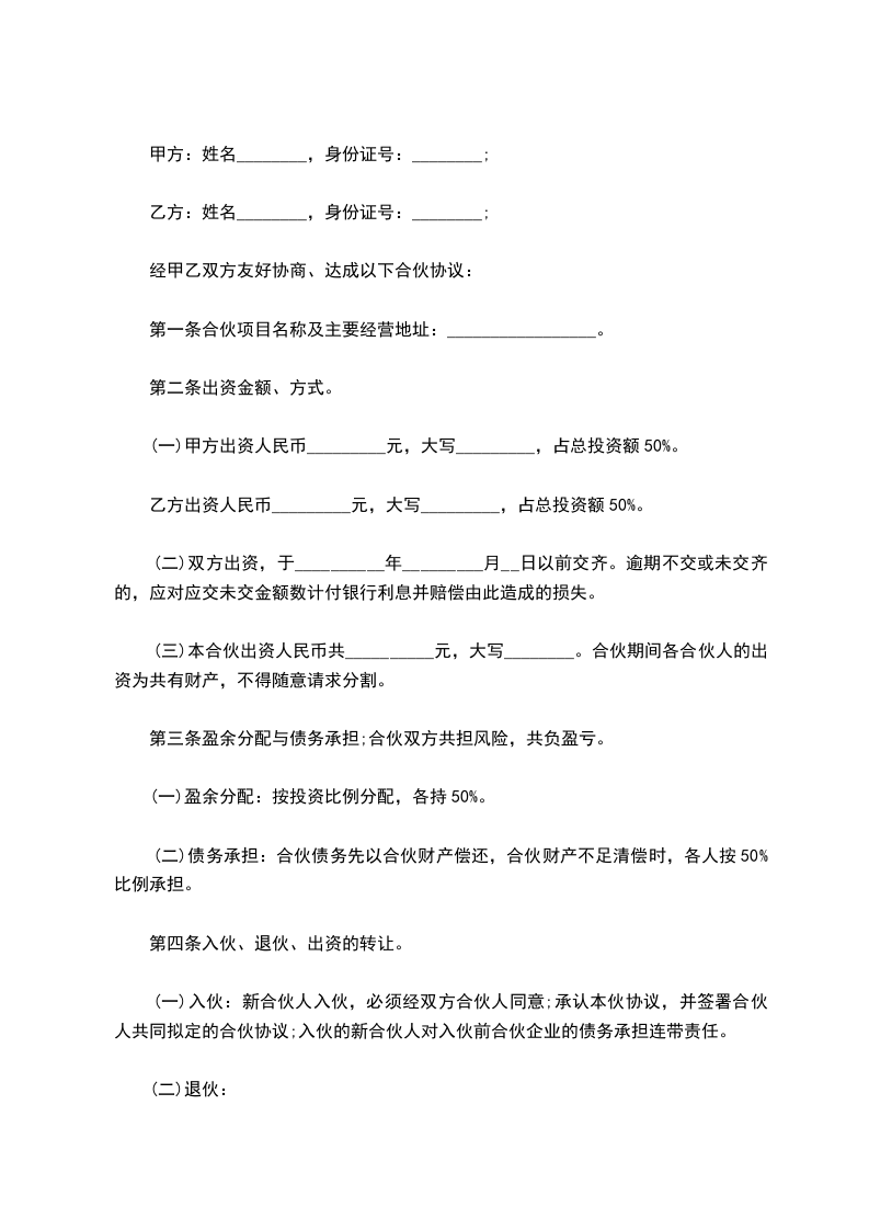 (二)债务承担:合伙债务先以合伙财产偿还,合伙财产不足清偿时,各人按50%比例承担。