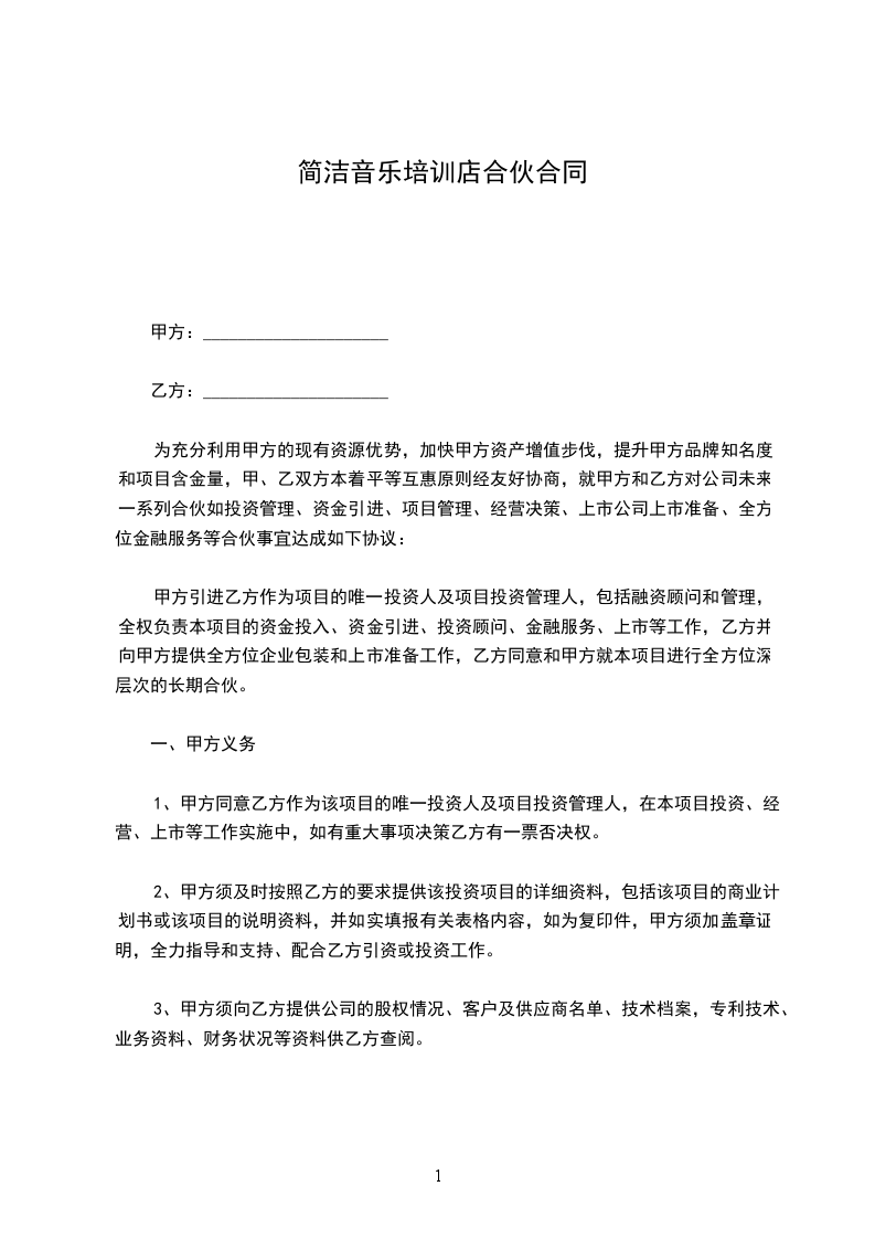 为充分利用甲方的现有资源优势,加快甲方资产增值步伐,提升甲方品牌知名度和项目含金量,甲、乙双方本着平等互惠原则经友好协商,就甲方和乙方对公司未来一系列合伙如投资管理、资金引进、项目管理、经营决策、上市公司上市准备、全方位金融服务等合伙事宜达成如下协议: