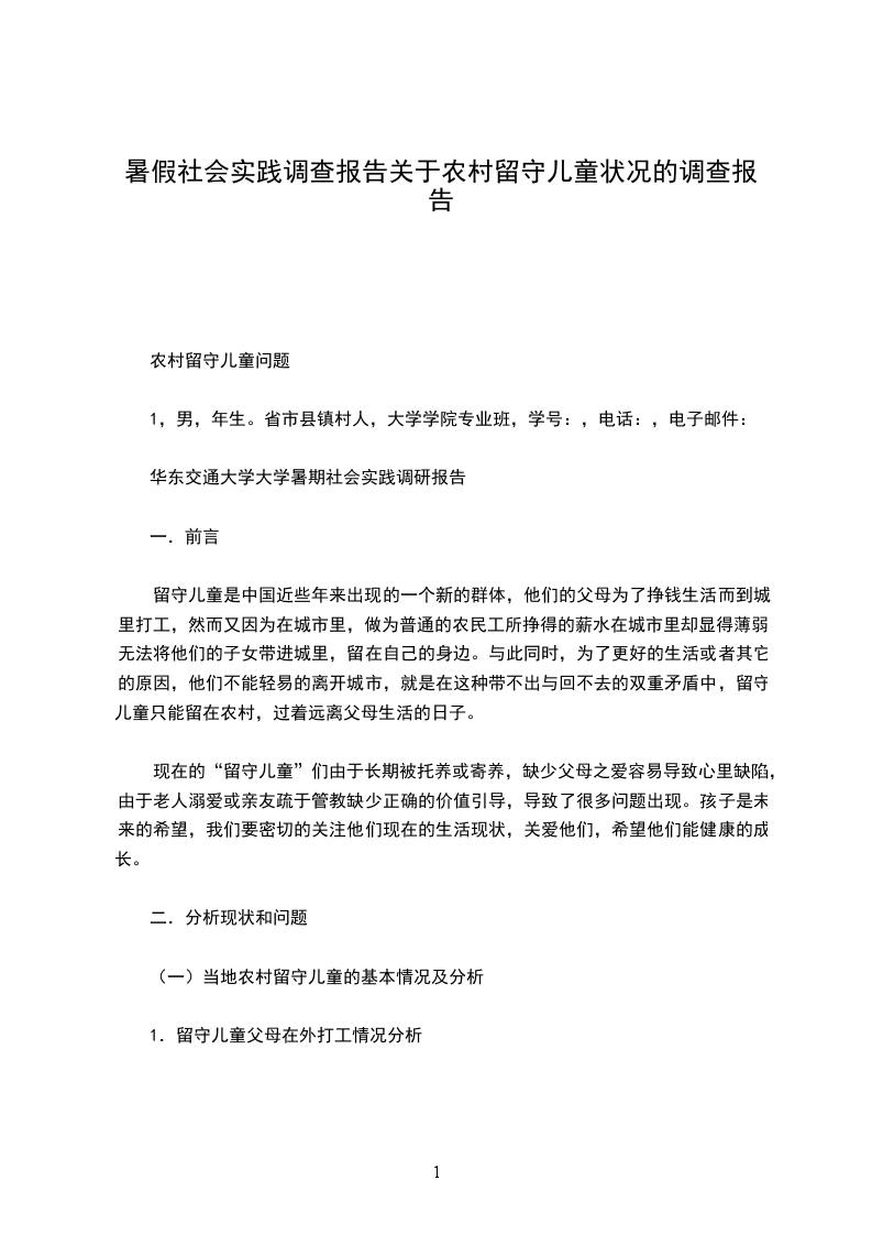 这次的社会调查对于我来说,是一份很重要的人生经验。不但增加了人生的经验,更使得我学会了关于社会调查工作上面的一些基础的知识。并且,使我们这些学生们从课堂上的理论课程环节中走出来,走到生活中去,将它们通过已有的知识实践出来。真的很感谢学校在课程上安排了这样一个教学任务。在完成它的过程中,我收获了许多宝贵的经验,更加的深刻的了解社会基层的一些情况。同时,希望社会能对留守儿童提供更多的关注吧,帮助他们能在生活里健康的成长。