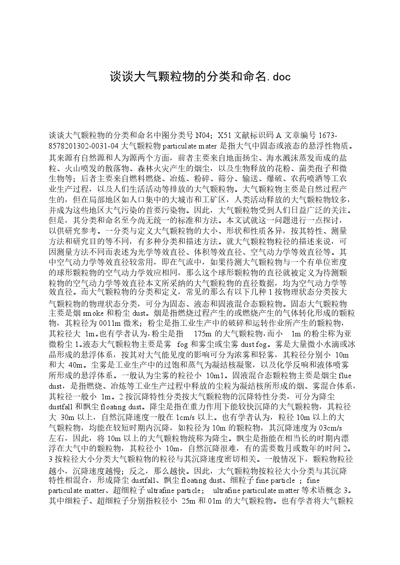 谈谈大气颗粒物的分类和命名中图分类号N04;X51文献标识码A文章编号1673-8578202402-0031-04大气颗粒物particulate mater是指大气中固态或液态的悬浮性物质。其来源有自然源和人为源两个方面,前者主要来自地面扬尘、海水溅沫蒸发而成的盐粒、火山喷发的散落物、森林火灾产生的烟尘,以及生物释放的花粉、菌类孢子和微生物等;后者主要来自燃料燃烧、冶炼、粉碎、筛分、输送、爆破、农药喷洒等工农业生产过程,以及人们生活活动等排放的大气颗粒物。大气颗粒物主要是自然过程产生的,但在局部地区如人口集中的大城市和工矿区,人类活动释放的大气颗粒物较多,并成为这些地区大气污染的首要污染物。因此,大气颗粒物受到人们日益广泛的关注。但是,其分类和命名至今尚无统一的标准和方法。本文试就这一问题进行一点探讨,以供研究参考。一分类与定义大气颗粒物的大小、形状和性质各异,按其特性、测量方法和研究目的等不同,有多种分类和描述方法。就大气颗粒物粒径的描述来说,可因测量方法不同而表述为光学等效直径、体积等效直径、空气动力学等效直径等。其中空气动力学等效直径较常用,即在气流中,如果待测大气颗粒物与一个有单位密度的球形颗粒物的空气动力学效应相同,那么这个球形颗粒物的直径就被定义为待测颗粒物的空气动力学等效直径本文所采纳的大气颗粒物的直径数据,均为空气动力学等效直径。而大气颗粒物的分类和定义,常见的那么有以下几种1按物理状态分类按大气颗粒物的物理状态分类,可分为固态、液态和固液混合态颗粒物。固态大气颗粒物主要是烟smoke和粉尘dust。烟是指燃烧过程产生的或燃烧产生的气体转化形成的颗粒物,其粒径为0011m微米;粉尘是指工业生产中的破碎和运转作业所产生的颗粒物,其粒径大 1m。也有学者认为,粉尘是指175m的大气颗粒物,而小 1m的粉尘称为亚微粉尘1。液态大气颗粒物主要是雾fog和雾尘或尘雾dust fog。雾是大量微小水滴或冰晶形成的悬浮体系,按其对大气能见度的影响可分为浓雾和轻雾,其粒径分别小 10m和大 40m。尘雾是工业生产中的过饱和蒸气为凝结核凝聚,以及化学反响和液体喷雾所形成的悬浮体系。一般认为尘雾的粒径小 10m1。固液混合态颗粒物主要是烟尘flue dust,是指燃烧、冶炼等工业生产过程中释放的尘粒为凝结核所形成的烟、雾混合体系,其粒径一般小 1m。2按沉降特性分类按大气颗粒物的沉降特性分类,可分为降尘dustfall和飘尘floating dust。降尘是指在重力作用下能较快沉降的大气颗粒物,其粒径大 30m以上,自然沉降速度一般在1cm/s以上。也有学者认为,粒径10m以上的大气颗粒物,均能在较短时期内沉降,如粒径为10m的颗粒物,其沉降速度为03cm/s左右,因此,将10m以上的大气颗粒物统称为降尘。飘尘是指能在相当长的时期内漂浮在大气中的颗粒物,其粒径小 10m,自然沉降很难,有的需要数月或数年的时间2。3按粒径大小分类大气颗粒物的粒径与其沉降速度密切相关。一般情况下,颗粒物粒径越小,沉降速度越慢;反之,那么越快。因此,大气颗粒物按粒径大小分类与其沉降特性相混合,形成降尘dustfall、飘尘floating dust、细粒子fine particle ;fine particulate matter、超细粒子ultrafine particle; ultrafine particulate matter等术语概念3。其中细粒子、超细粒子分别指粒径小 25m和01m的大气颗粒物。也有学者将大气颗粒物按其粒径分为粗粒子coarse particle和细粒子两大类,将粒径大 25m的大气颗粒物统称为粗粒子。4按可进入呼吸系统的粒径范围分类不同粒径的大气颗粒物可进入和沉积 呼吸系统的不同部位,并以此为依据,引入了可吸入颗粒物inhalable particles的概念。国际标准化组织建议可吸入颗粒物的粒径定义为小 或等 10m的粒子,有关研究资料说明,可吸入颗粒物中,粒径大 5m的多阻留 上呼吸道;粒径小 5m的可进入下呼吸道,并在气管、支气管和肺泡中滞留或沉积,尤其是粒径小 25m的颗粒物,可进入肺泡中,对人体造成的危害尤为严重4-5。5按其他特性分类仍有多种分类和命名,如大气颗粒物按其主要成分,分为有机、无机和生物性颗粒物;按其物理化学性状在大气环境中的变化分为一次颗粒物和二次颗粒物。一次颗粒物是指自然或人类活动直接释放到大气中的颗粒物;二次颗粒物是指进入大气中的颗粒物通过化学反响或物理化学过程转化形成的颗粒物。此外,大气颗粒物还可以按其吸湿性,分为吸湿性、亲水性和非吸湿性、憎水性大气颗粒物;按大气颗粒物的形成状态,分为分散性、凝聚性大气颗粒物;按大气颗粒物的粒度模态,分为爱根核模、积聚核模和粗粒子模等。二原那么与方法大气颗粒物的各种粒子,按其分类和定义进行命名,须满足专有名词术语的根本要求。一般说来,其命名主要应具有单义性和科学性。其命名方法主要是在这一专业的知识体系,运用系统性原理进行全面、统一的分析研究,并按系统性原那么确定其命名。1关 术语的单义性和科学性专有术语所表达的概念应具有特定含义和准确的语义范围。它不仅应与相近的术语概念相区别,在其专业范围内具有单义性;而且其定义所标记的概念应反映其本质特征,其知识内容具有科学性。比方在大气颗粒物研究中,粒径大 10m的颗粒物称为降尘,小 10m的称为飘尘,其语义范围是准确的。当然,从定义科学性和完整性考虑,将降尘定义为“粒径大 