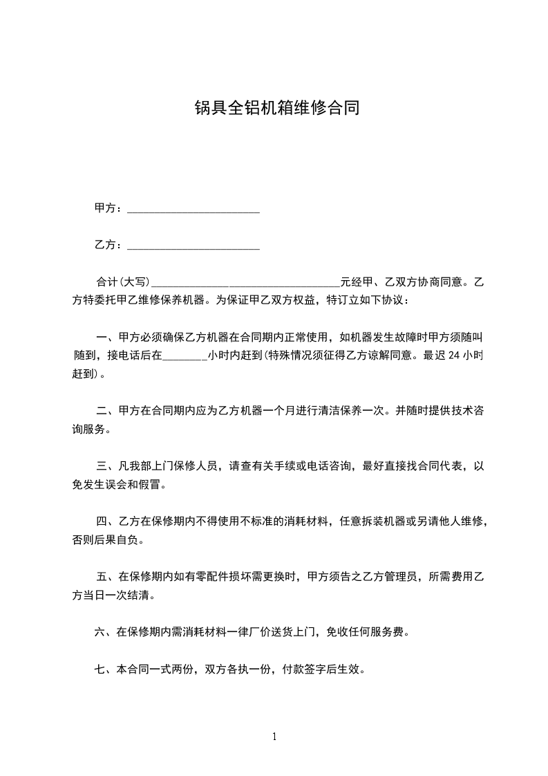 合计(大写)__________________________________元经甲、乙双方协商同意。乙方特委托甲乙维修保养机器。为保证甲乙双方权益,特订立如下协议: