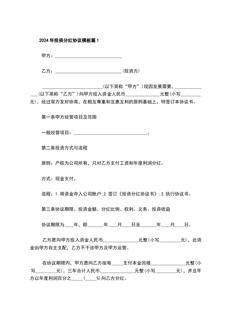 2024年投资分红协议模板篇2